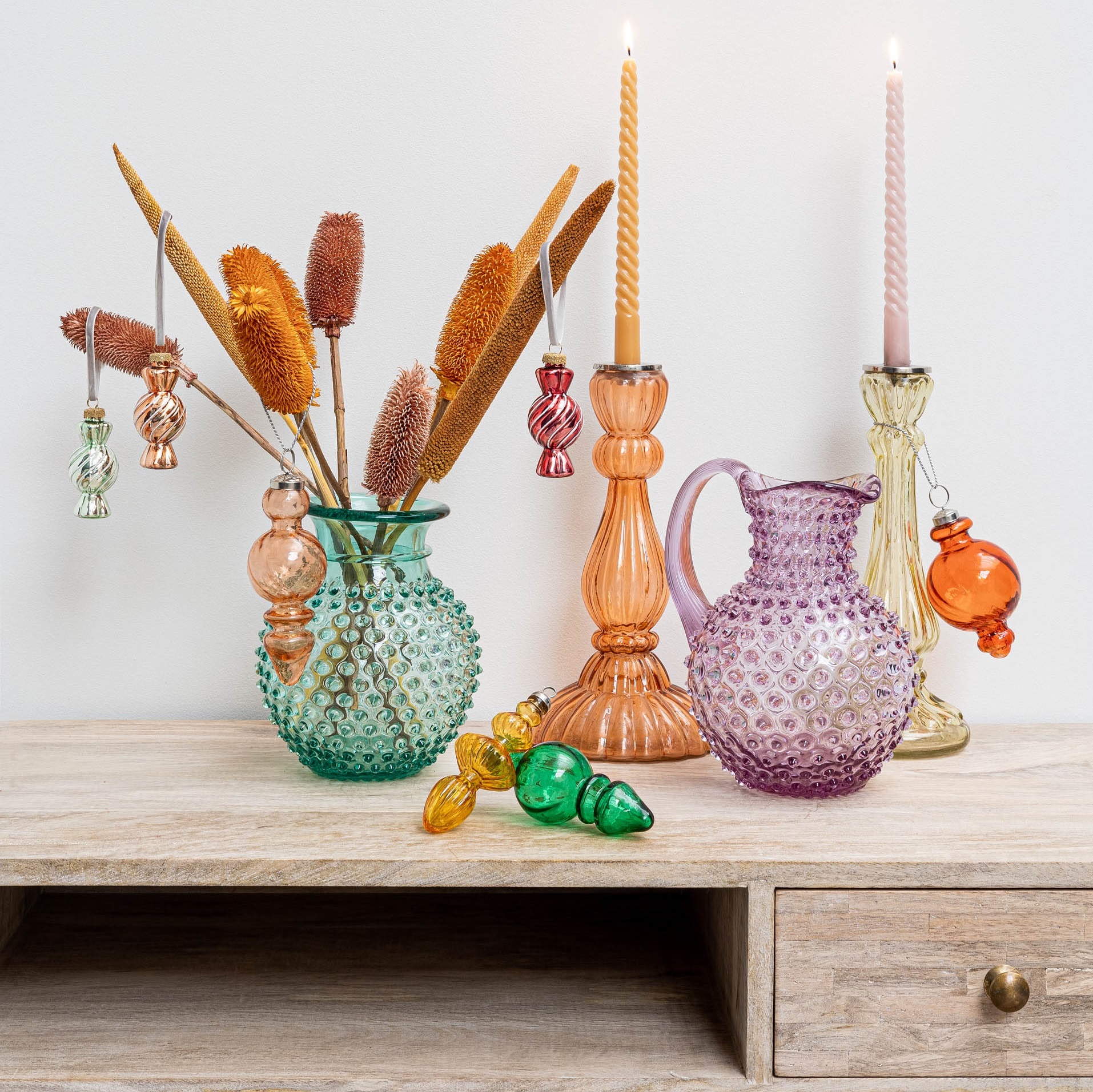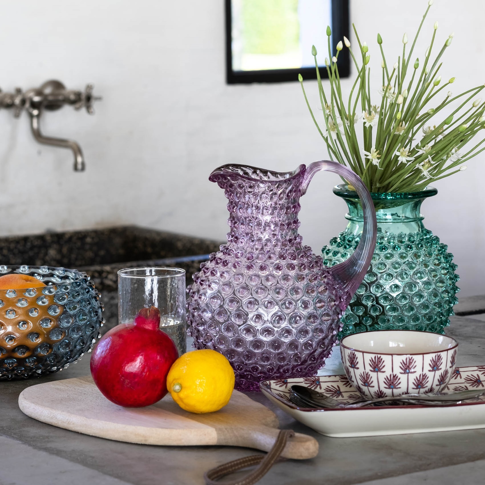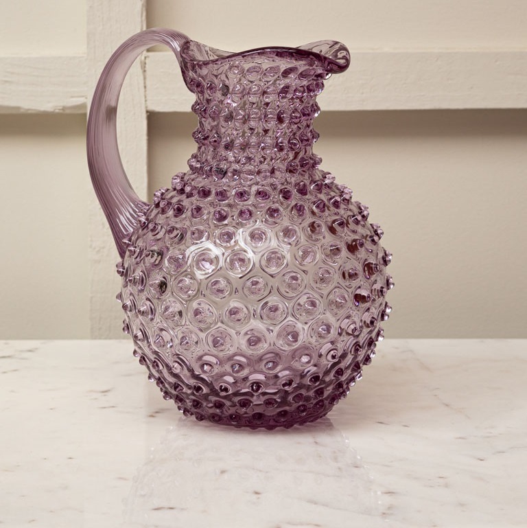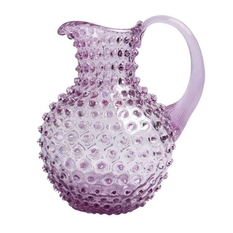 Этот изящный кувшин выполнен из прозрачного стекла с мягким сиреневым оттенком. Его поверхность украшена множеством небольших, объемных пузырьков, создающих текстурированный эффект. У формы плавные, округлые линии, с узким горлышком и широкой, округлой основой, что придает ей элегантный и гармоничный вид. Удобная ручка с легким изгибом делает использование предмета комфортным. Такой стеклянный сосуд станет ярким акцентом в интерьере, добавляя нотки изящества и художественного стиля. Также можно использовать в качестве вазы.