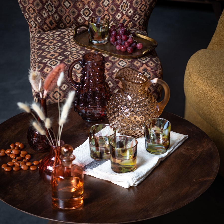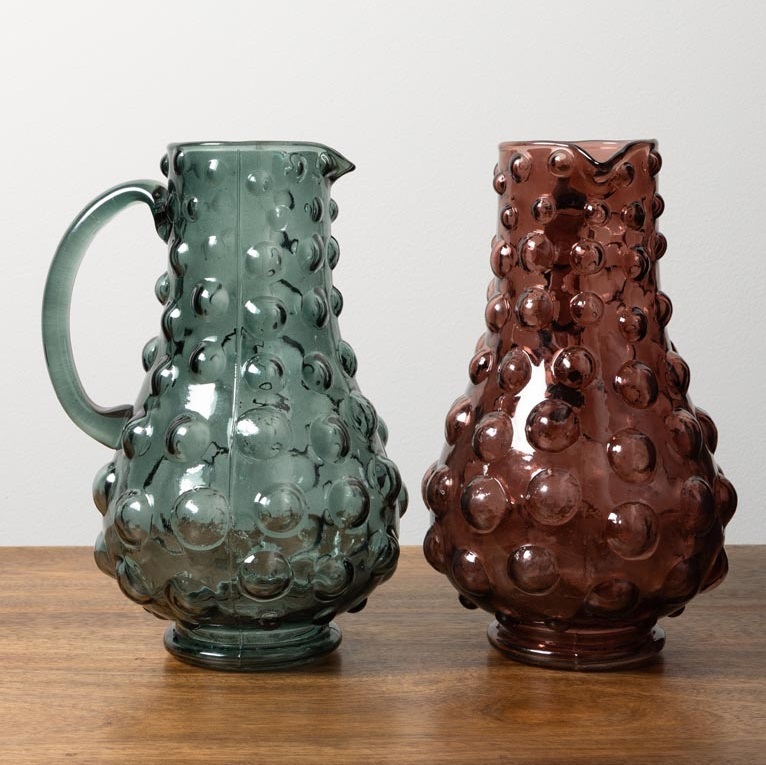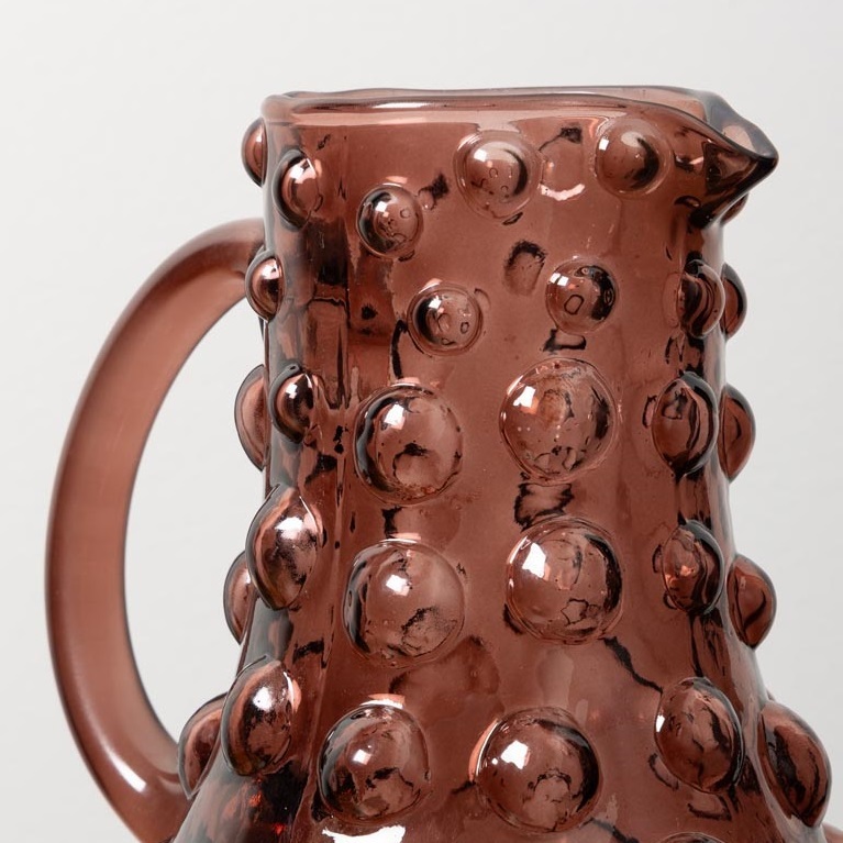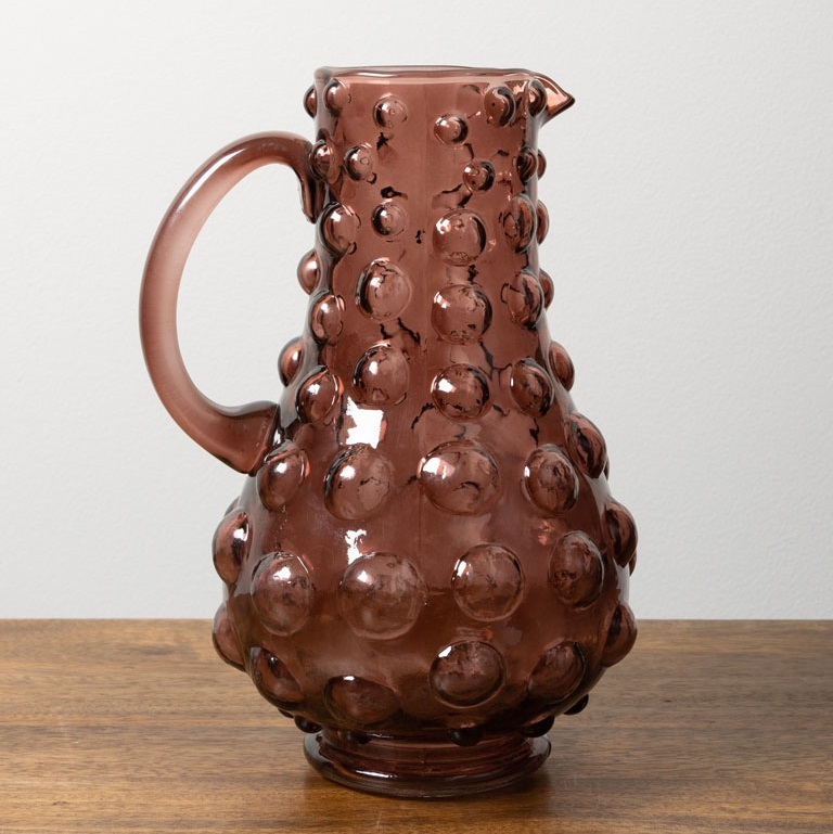 Этот кувшин выполнен из стекла. Его форма изящная и гармоничная: широкое, округлое основание плавно сужается к узкому горлышку, что обеспечивает устойчивость и удобство при использовании. Особенностью дизайна являются многочисленные объемные пузыри, расположенные по всей поверхности кувшина, создающие эффект текстурированности и придающие ему оригинальный, современный вид.Такой предмет станет стильным акцентом в интерьере и поможет подчеркнуть индивидуальность пространства.