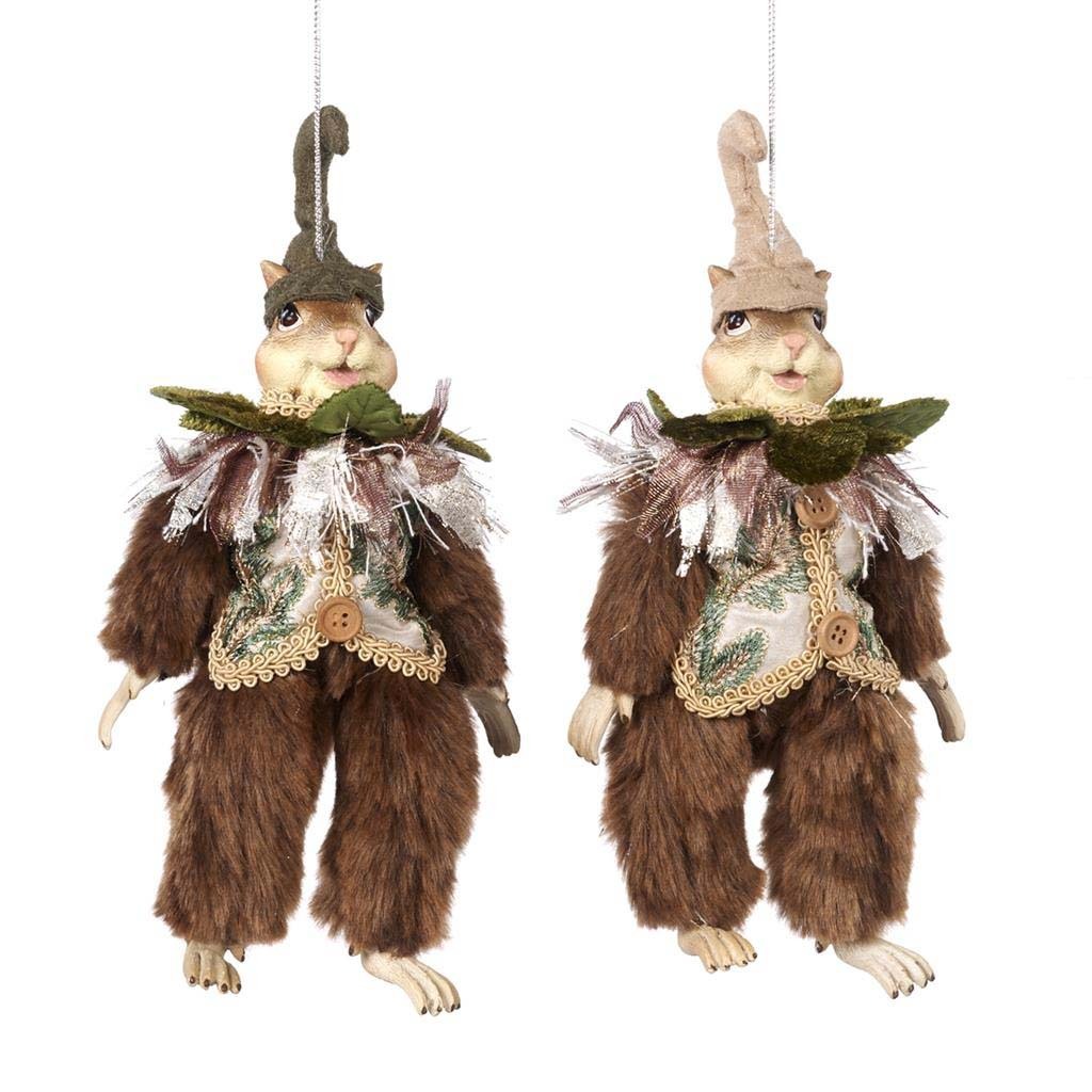 Милый зверёк из меха, наряженный в интересный колпачок, нарядную жилетку с лесным принтом и шарфик, из-за которых кукла приобретает еще более забавный вид.