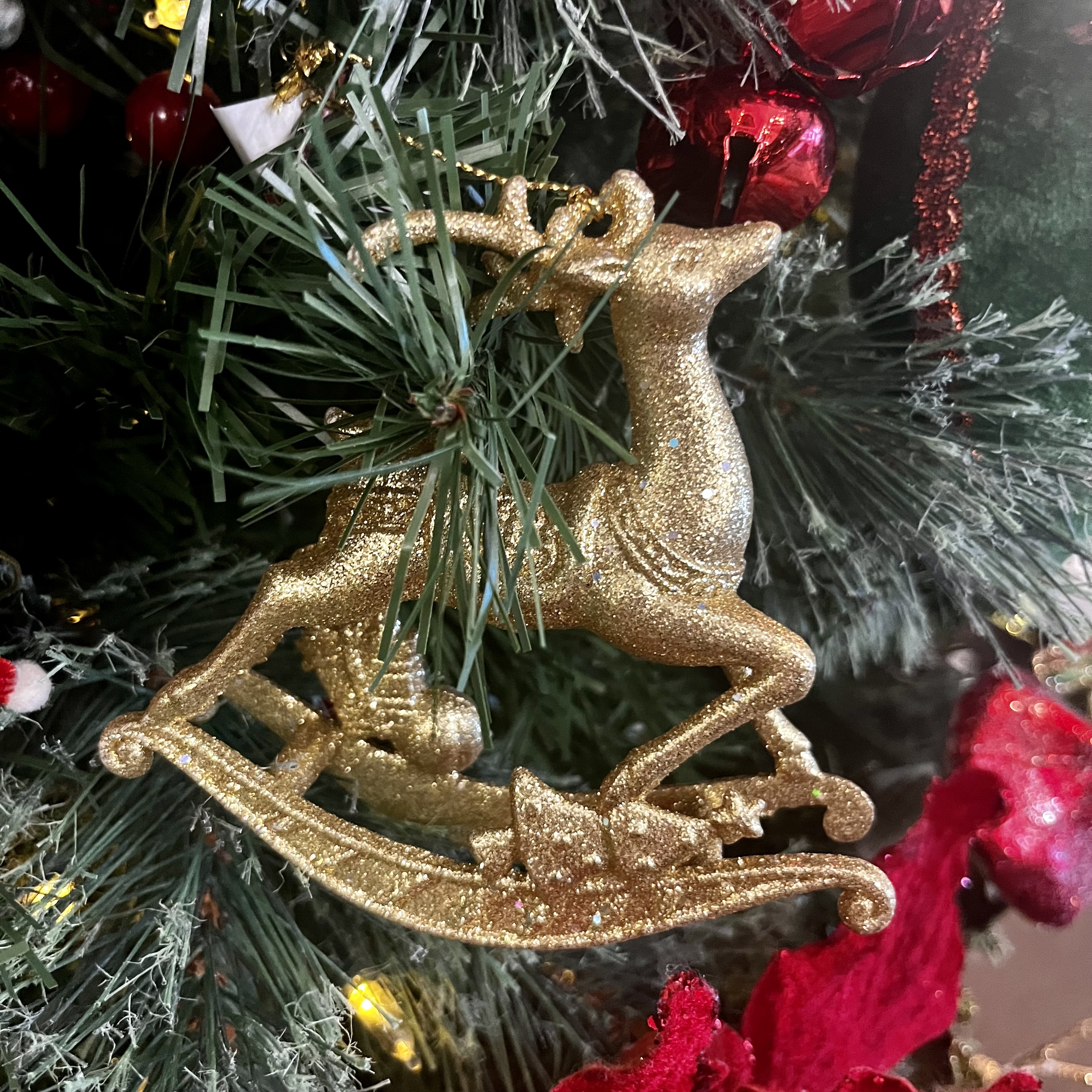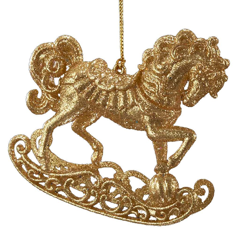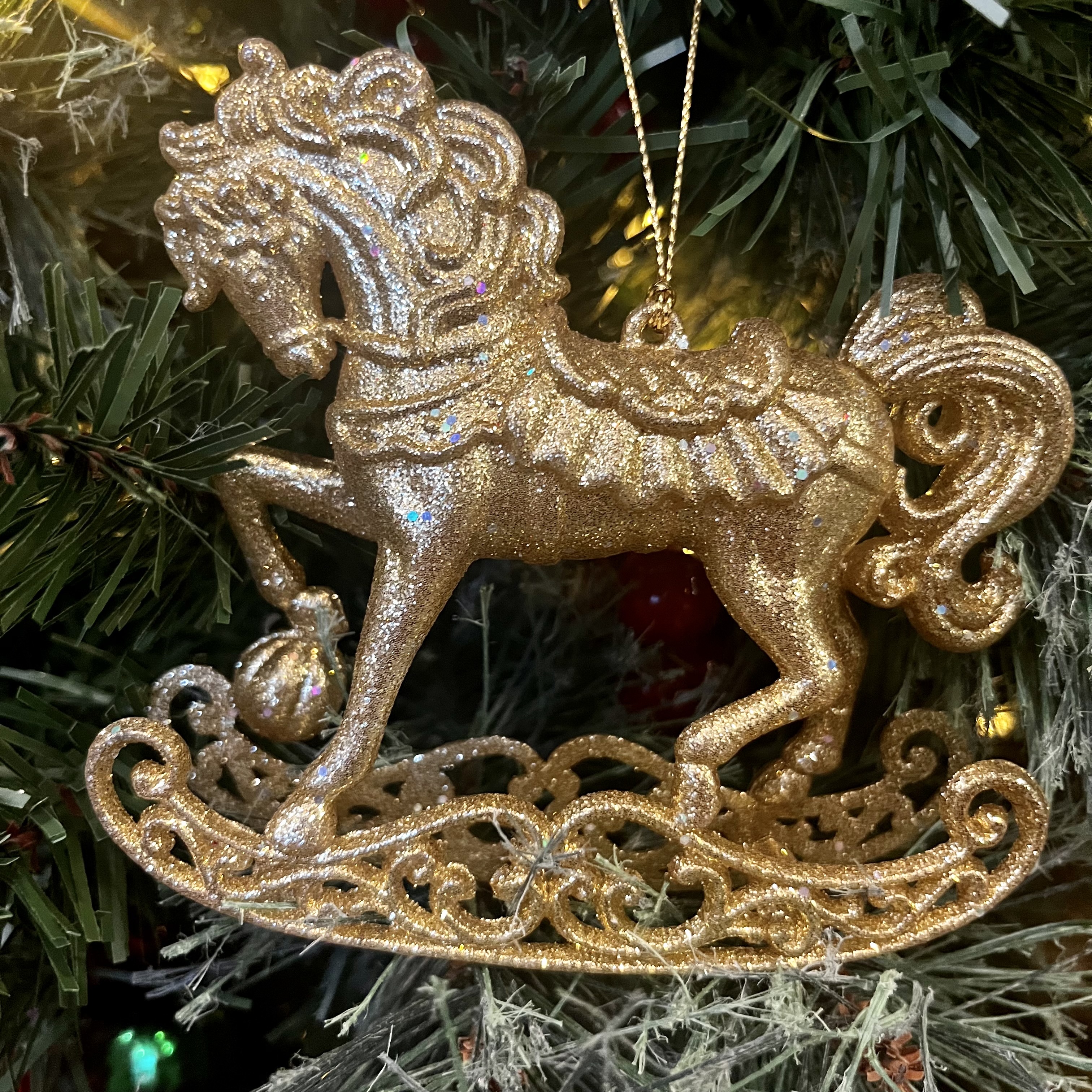 Золотистый изящный олень с витиеватыми рогами и лошадка сплошь усыпаны блёстками, которые будут блестеть и переливаться в огоньках новогодней гирлянды, привлекая внимание к этим красивым ёлочным игрушкам. Подвесить игрушку на ёлку Вы сможете с помощью прикреплённого к ней золотистого шнурка. А благодаря застывшей позе будет казаться, что они перепрыгивают с ветки на ветку.