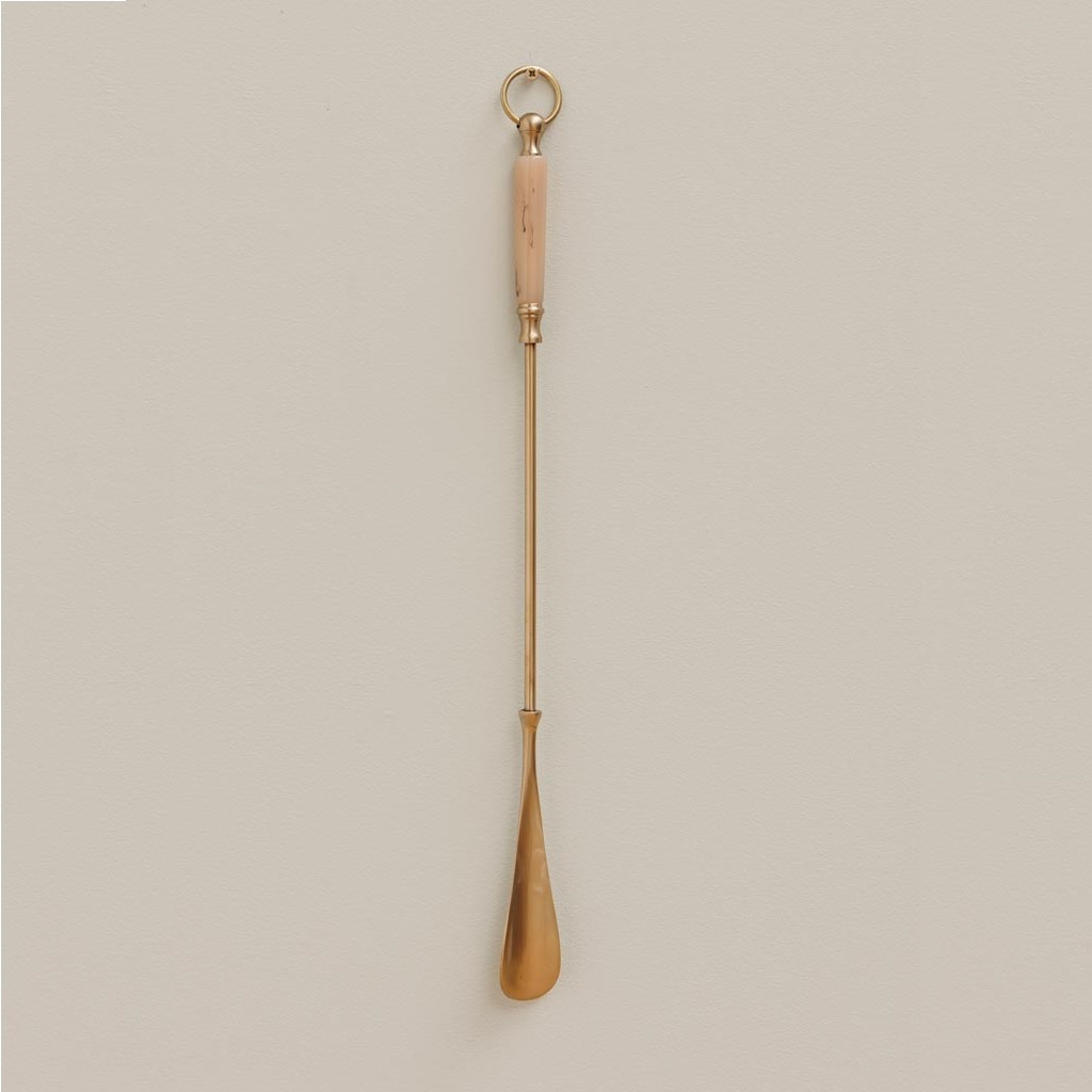 Это ложка для обуви выполнена из латуни. Такой аксессуар обычно используется для аккуратного снятия или подъема обуви, а также для украшения прихожей или обувной полки. Латунь придает ей элегантный и изысканный вид, благодаря чему она хорошо впишется в стильный и уютный интерьер.
