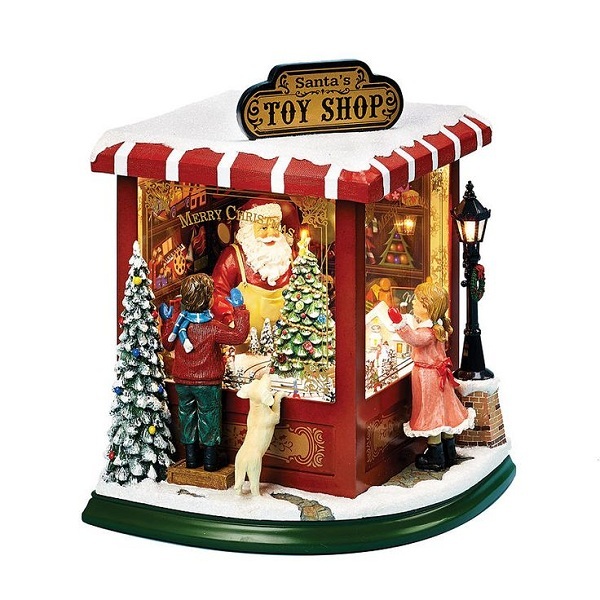 Это анимированный музыкальный спектакль, на котором изображён Санта, усердно работающий в своей игрушечной мастерской. Изящно вырезанные вручную и раскрашенные богатыми красочными деталями, двое детей и их собака стоят возле углового магазина Санты, прижав руки в рукавицах к украшенному стеклу. По обеим сторонам магазина расположен уличный фонарь со светодиодной подсветкой и заснеженная сосна. 12 мелодий, громкость регулируется.