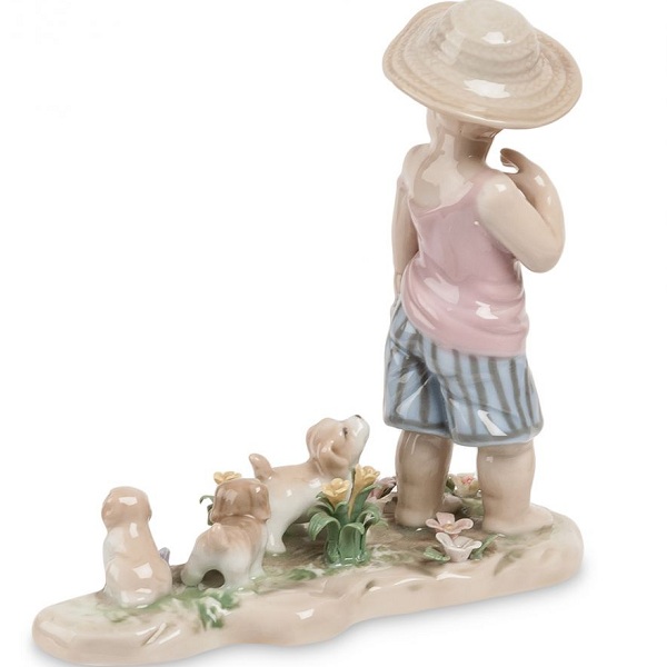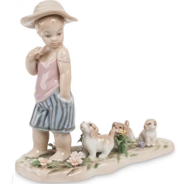 Статуэтка в виде мальчика со щенками выполнена из фарфора высокого качества, сверху покрыта глянцевым лаком. Стиль, в котором простота форм объединяется с изяществом и завершённостью. Послужит отличным подарком.