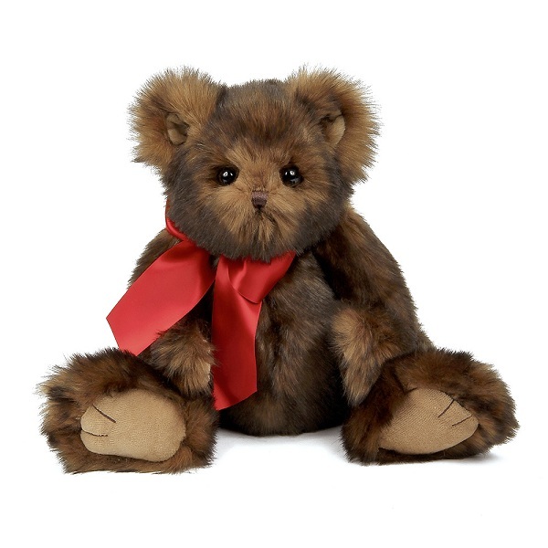Плюшевый мишка с длинным ворсом восхитительного тёмного цвета. У него мягкие лапки и великолепные янтарные глаза.