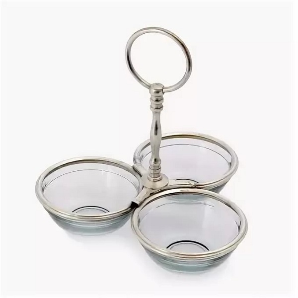 Менажница с тремя чашами, обрамленными металлическими ободками с удобной фигурной металлической ручкой. Металл обработан под старину.