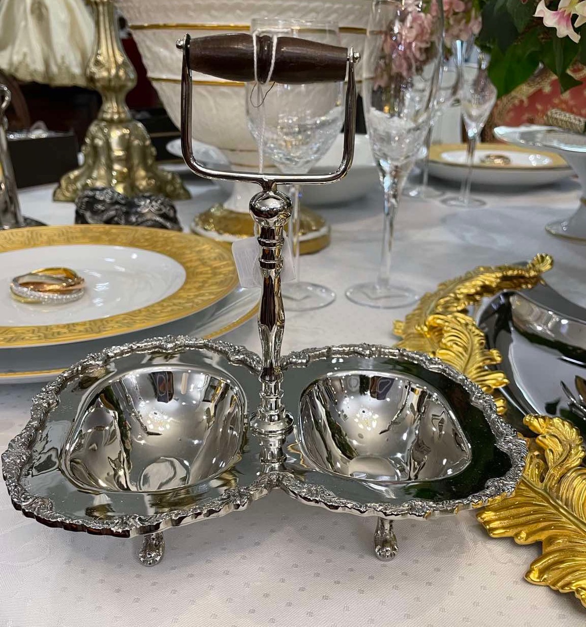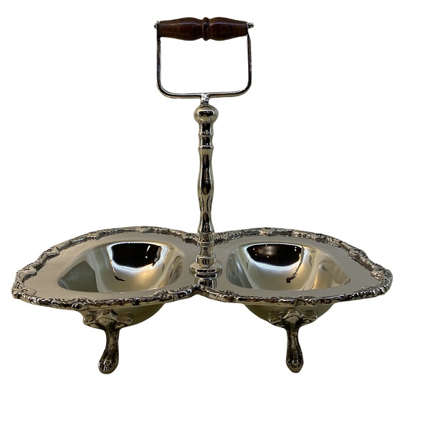 Менажница с двумя чашечками для соуса и закусок. Выполнена из латуни с никелевым покрытием и оформлена удобной ручкой для переноски.