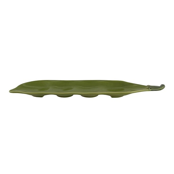 Блюдо фигурное изготовлено из качественной керамики высшего класса в стиле майолика. Изготовлено в виде половинки стручка гороха, раскрашено вручную и стоит на четырёх горошинах, на одном конце блюда есть зеленый хвостик, что даёт необыкновенное сходство с настоящим горохом. В таком эксклюзивном блюде можно подавать соусы, холодные закуски. Вся поверхность изделия глянцевая благодаря покрытию влагостойкой глазурью. Можно мыть в посудомоечной машине и ставить в микроволновую печь.