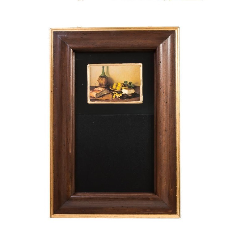Оригинальная идея подачи обычной менюшницы: в верхнем поле – кухонный панно-натюрморт, в нижней части – поле для записей с мелком. В раме из натурального дерева ручной работы. В оформлении использовано сусальное золото.