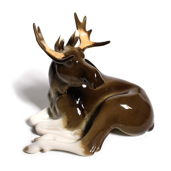 Красивая крупная скульптура создана была в 1983 году. Интересно её рассматривать со всех сторон. Вот молодой лось прилёг отдохнуть, однако что-то привлекло его внимание. Голова зверя резко повёрнута назад, взгляд полон тревоги, уши напряжены, рога - в боевой готовности. При этом линии очень плавные, узнаётся рука мастера. Фигура создана на Императорском фарфоровом заводе из мягкого фарфора. Достойное украшение коллекции!