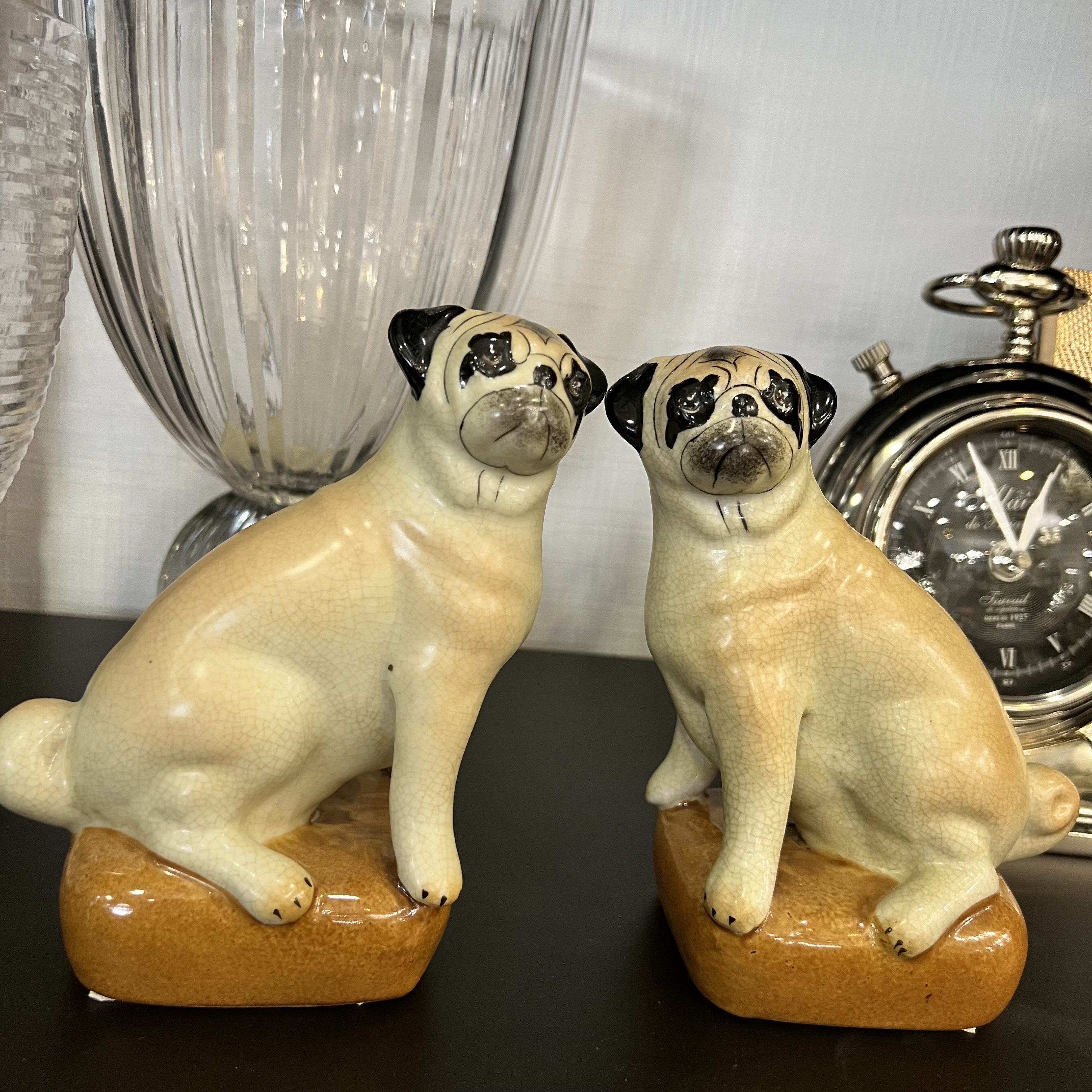 Миловидные статуэтки мопсов. Ласковые и добрые щенки словно замерли на секунду и решили остаться неподвижными специально, чтобы радовать людей своим видом. Набор из двух штук.