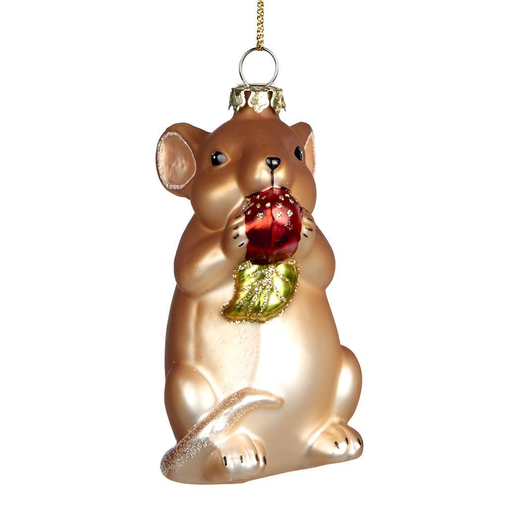Нарядное украшение на ёлку представлено в виде миниатюрного мышонка, который держит в лапках вкуснейшую ягодку. Игрушка ручной работы поможет красиво оформить новогоднее торжество в классической тематике и тематике таинственного леса.