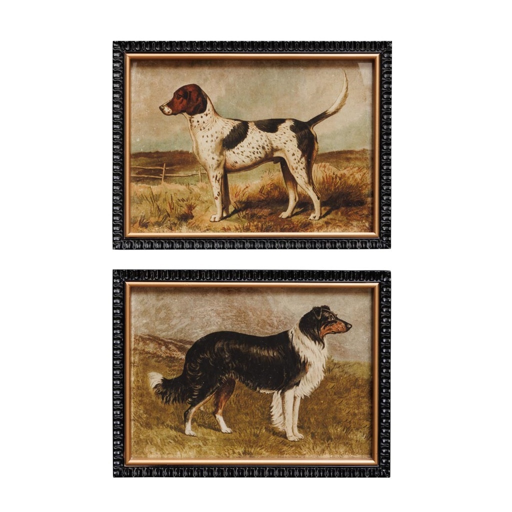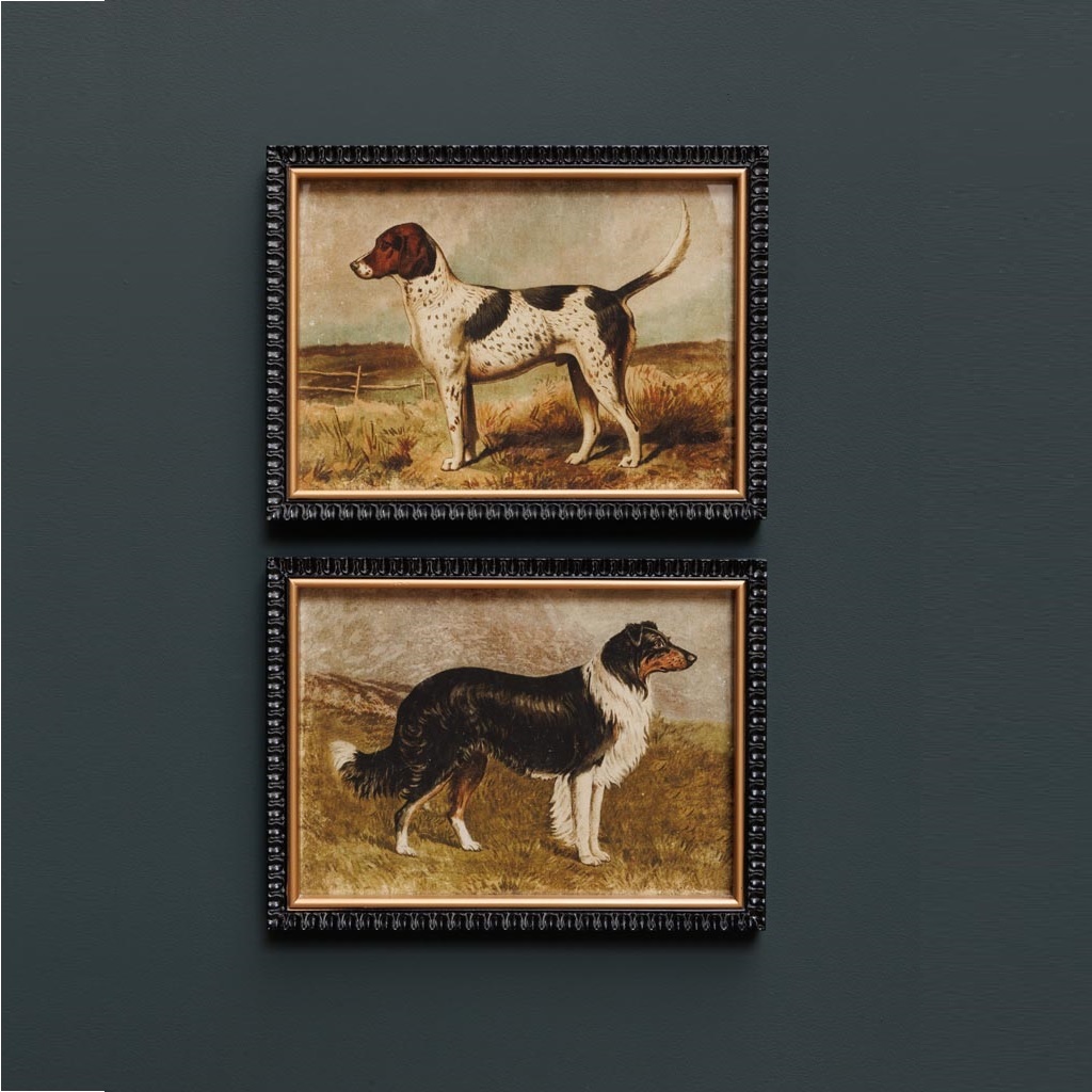 Набор из двух постеров с изображениями собак, выполненных в классическом художественном стиле. Каждый постер представлен в рамках с декоративной рамкой с тёмной окантовкой и золотистым внутренним ободком. Оба постера прекрасно дополняют друг друга, создавая гармоничную композицию для домашнего интерьера или коллекции.