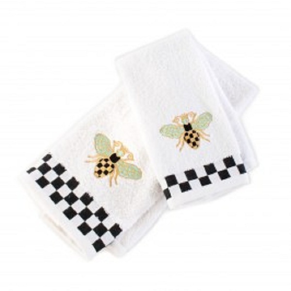Набор полотенец из двух штук от MacKenzie-Childs. Белоснежные полотенца украшены королевскими пчёлами, вышитым на плюшевой махровой ткани из 100% хлопка, которая отделана тканой чёрно-белой клетчатой каймой.