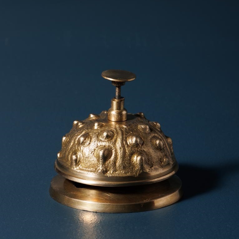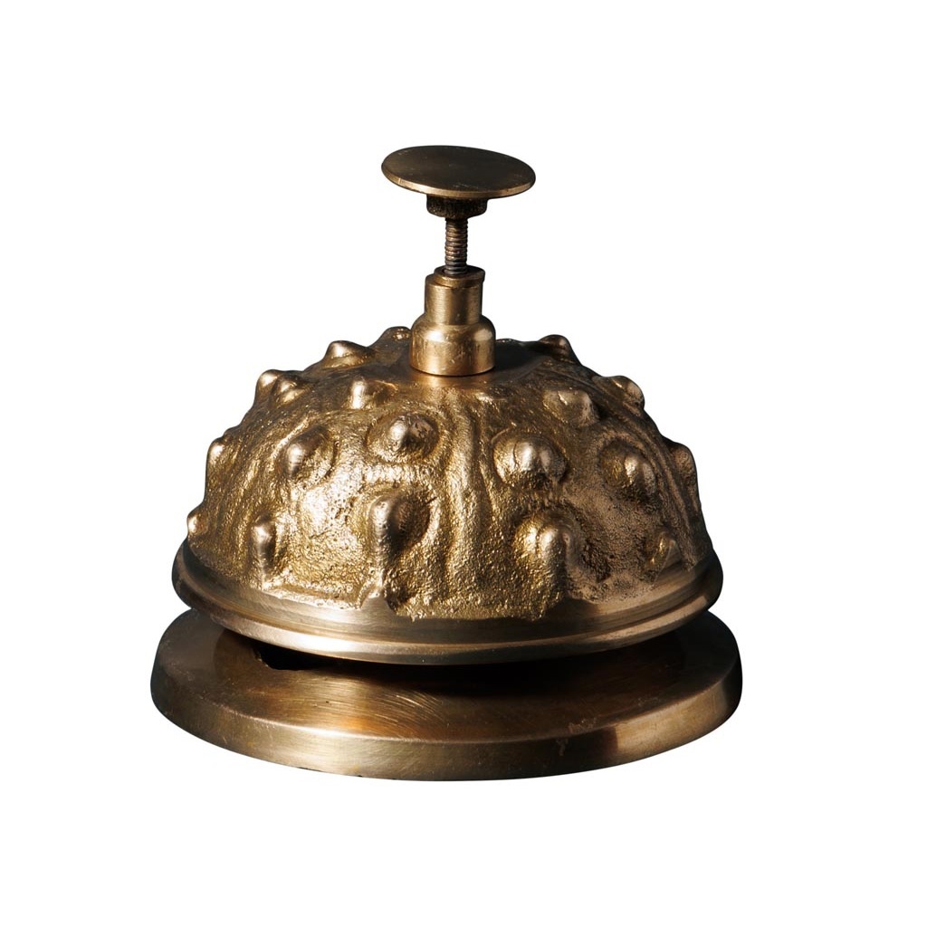 Этот звонок, выполненный из металла, имеет необычную, рустикальную текстуру с выступами и неровностями, что придает ему антикварный и уникальный вид. Верхняя часть — плоская круглая кнопка, которая используется для звона, а основание — широкое и устойчивое. Такой звонок может служить декоративным элементом или использоваться как оригинальный настольный звонок в интерьере кафе, ресторана, стойки ресепшн.
