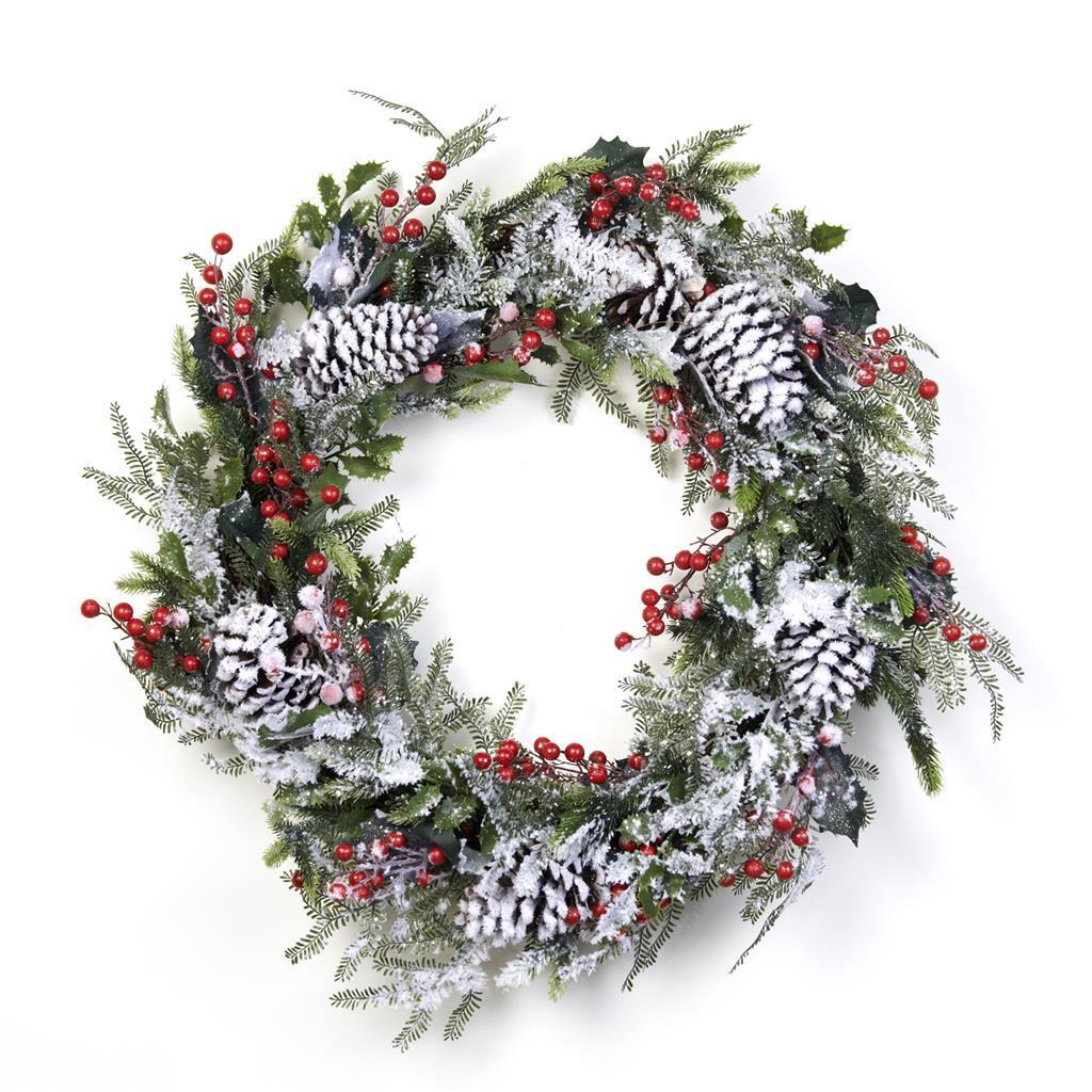 Новогодний декоративный венок выглядит очень нарядно, благодаря декору в виде искусственного снега, настоящих шишек и красных ягод. Само украшение ручной работы выглядит так, как будто его только что принесли из заснеженного леса.