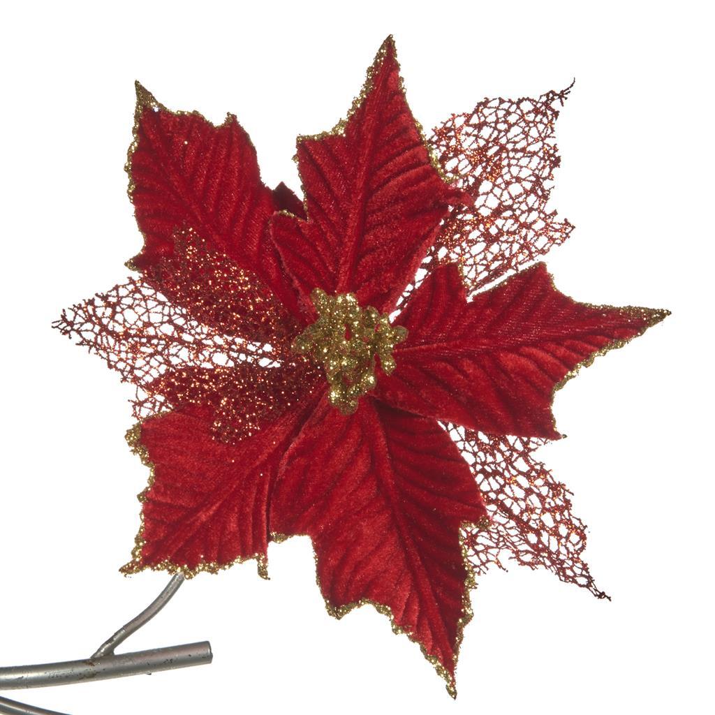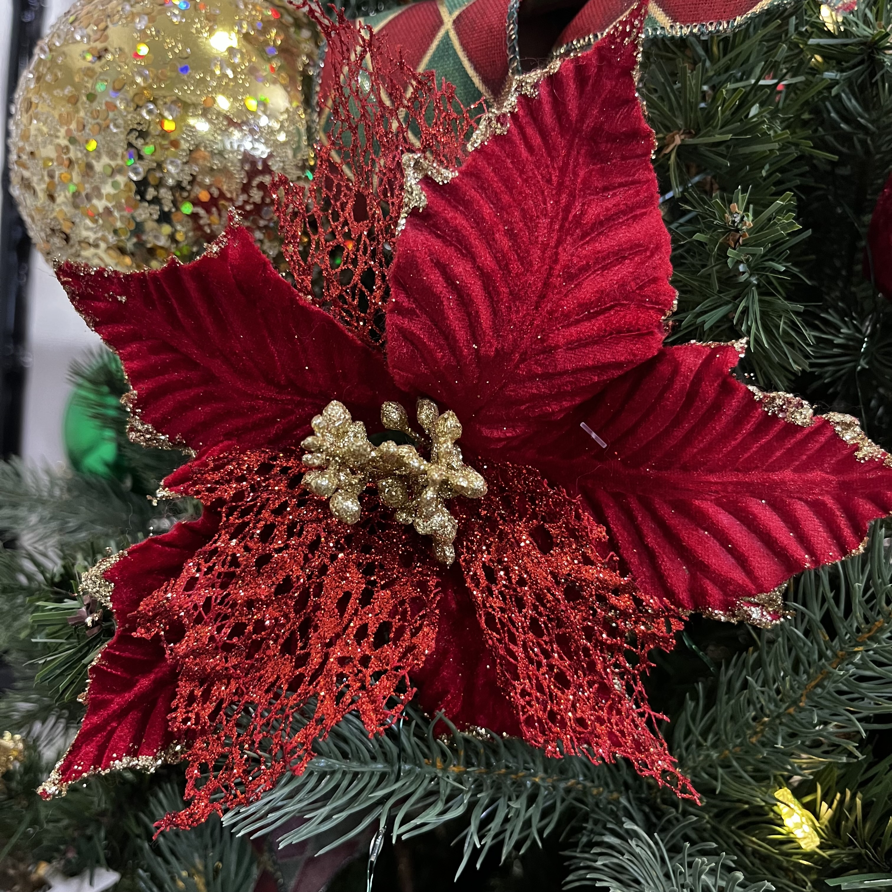 Искусственный цветок красной новогодней пуансеттиии для оформления праздника в классическом стиле. Украшение на ёлку, венок, гирлянду оформлено из дорогого текстиля и украшено глянцевыми пайетками. Крепится на ветку с помощью клипсы.