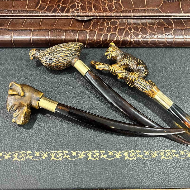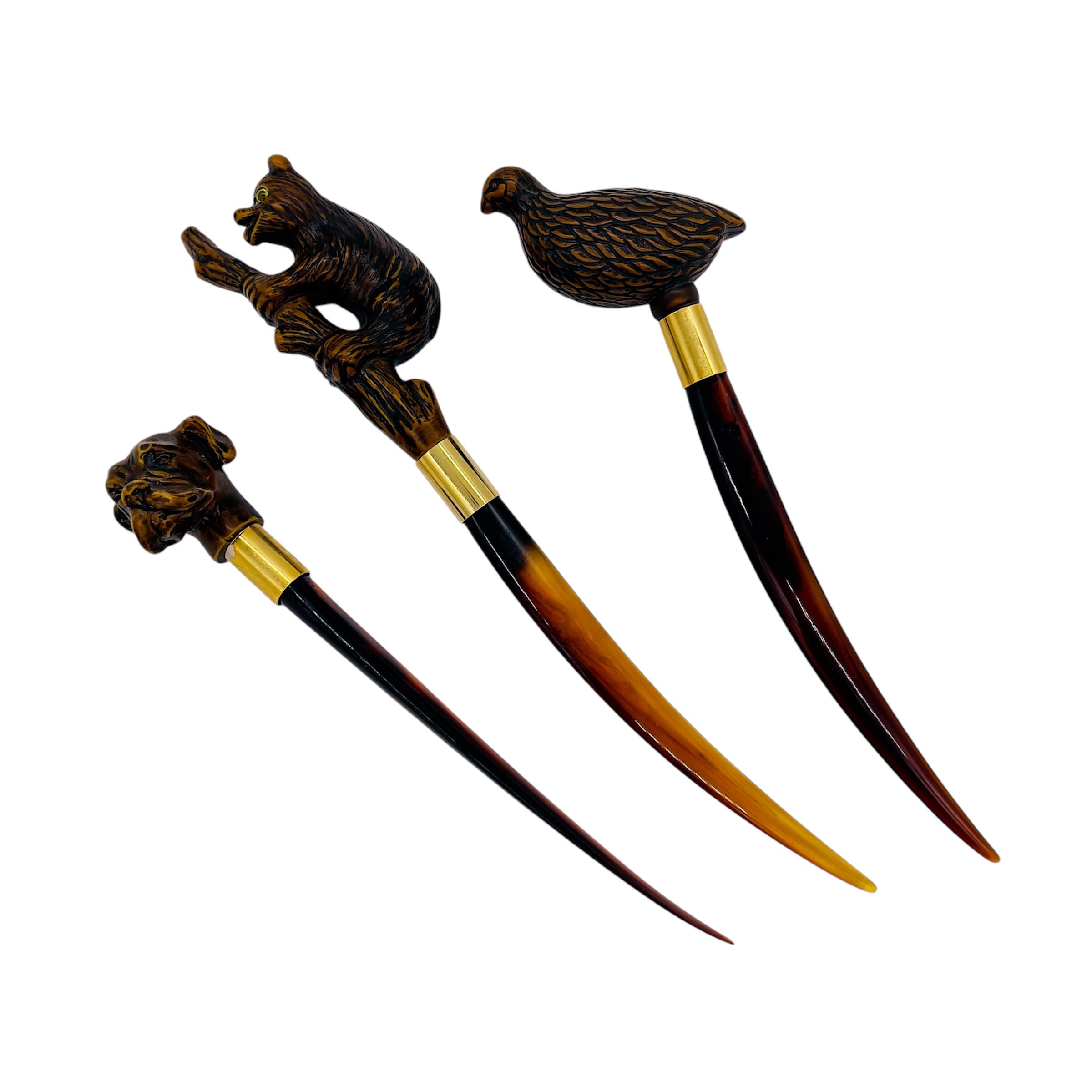 Ножи для писем в ассортименте. На рукояти изображения: бульдога, птицы, медведя.