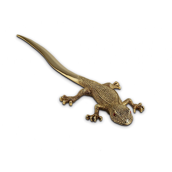 Тщательно и с вдохновением выполненный металлический нож для бумаг в виде ящерицы с позолотой 24К, сложный в цвете, богатый в структуре и глобальный в дизайне.