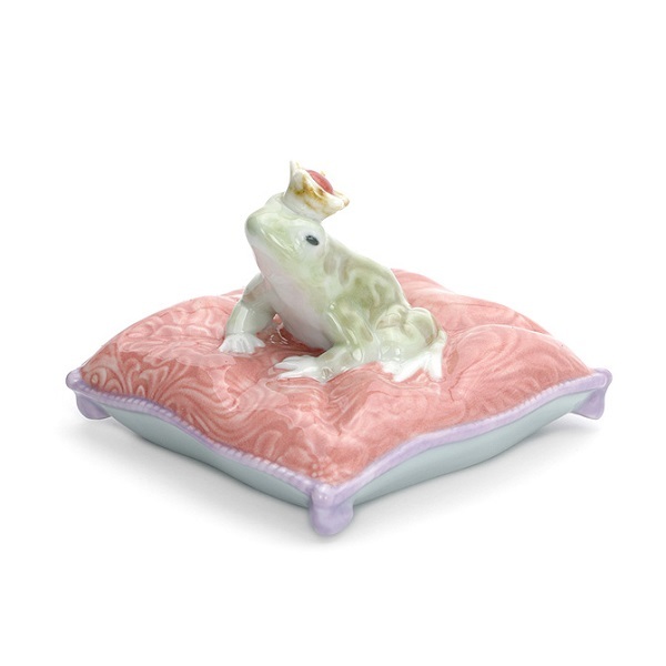 Зелёно-белая лягушка с золотой короной, увенчанной красной бархатной чашечкой, покоится на элегантной подушке, как будто это и есть трон настоящего короля. Подушка мягкая красная с дамасскими драпировками и галантерейной кисточкой фиолетового цвета. Скульптор: José Javier Malavia.