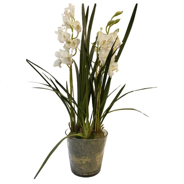 Симбидиум в стеклянном кашпо выглядит очень реалистично. Листва и ветки выполнены из высококачественного гипоаллергенного материала, который позволяет создать ботанически точную копию растений.