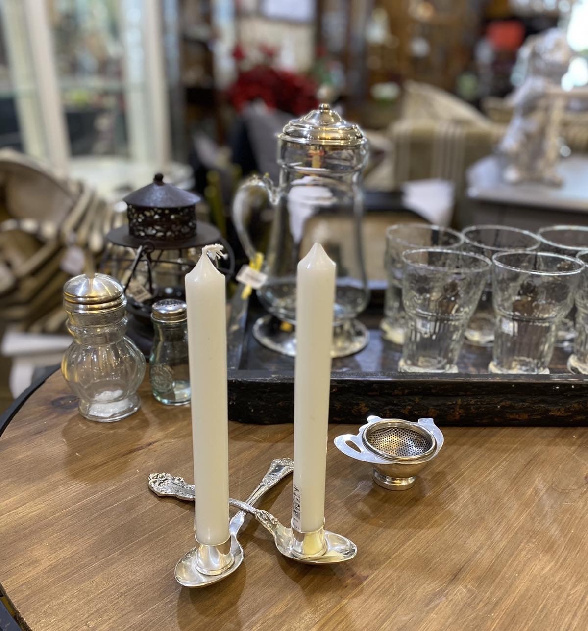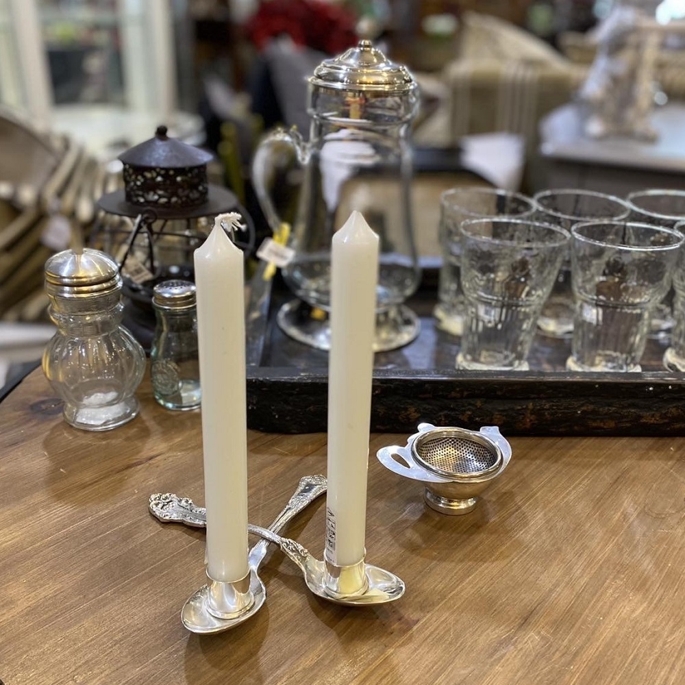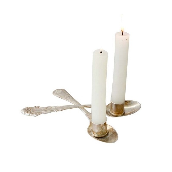 Подсвечник в игривом дизайне в виде двух скрещённых десертных ложек. Стильная сборка, идеальная для кухни, кафе или ресторана.