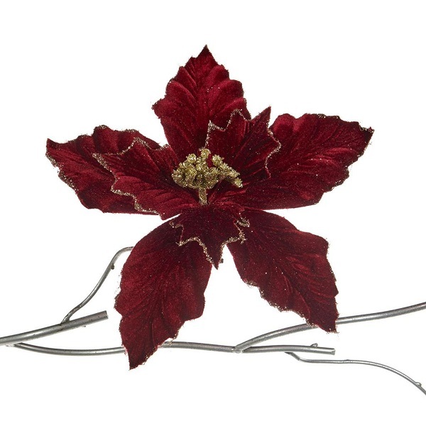 Бордовая пуансетия из бархата поможет создать роскошные акценты в нужных местах на ёлке. Украшение из благородной ткани закрепляется на еловых ветвях посредством специальной клипсы.
