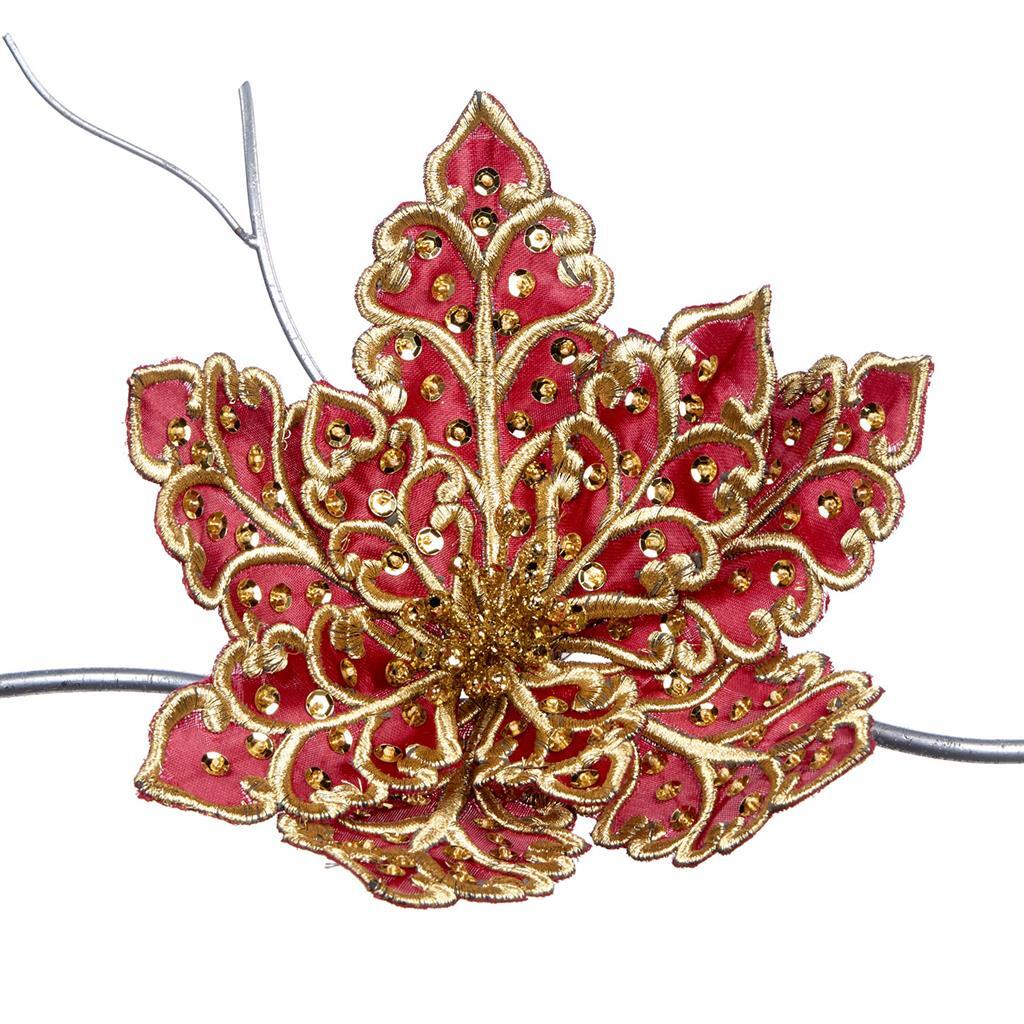 Обворожительная, нежная и аристократичная пуансеттия с празднично мерцающими искорками в сердцевинке и по краю лепестков напоминает чудесную, очень тёплую и волшебную звёздочку! Искусственный цветок красной новогодней пуансеттиии для оформления праздника в классическом стиле. Украшение на елку, венок, гирлянду оформлено из дорогого текстиля и украшено глянцевыми пайетками. Крепится на ветку с помощью клипсы.