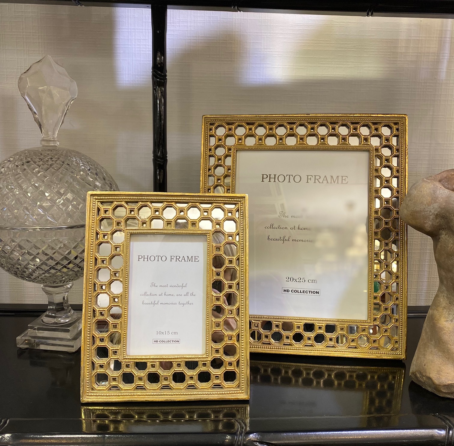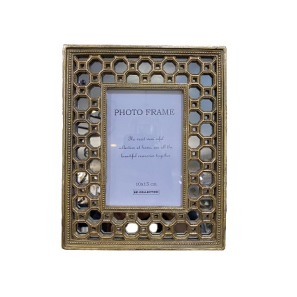 Фоторамка золотого цвета с узором в виде сот на зеркальной поверхности. Подойдёт как в классический, так и в современный стиль интерьера.