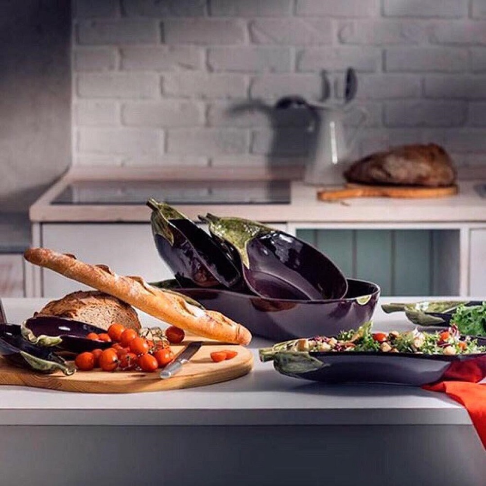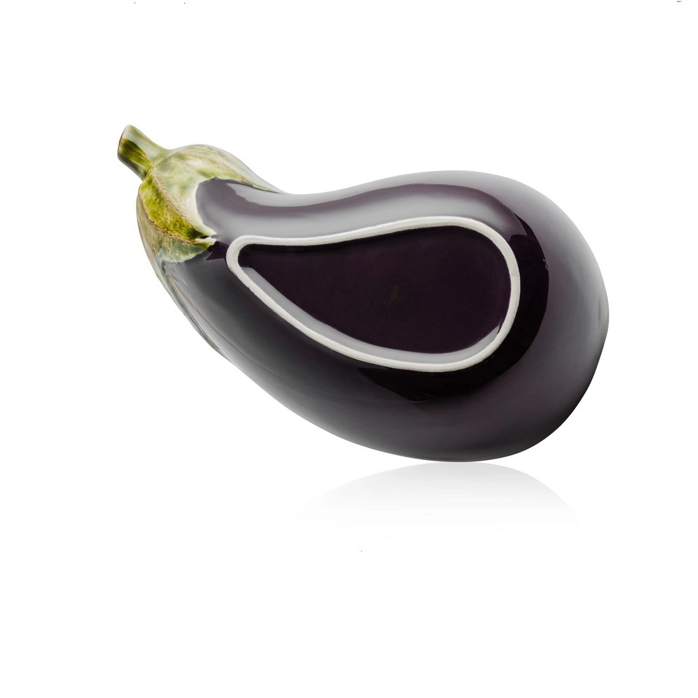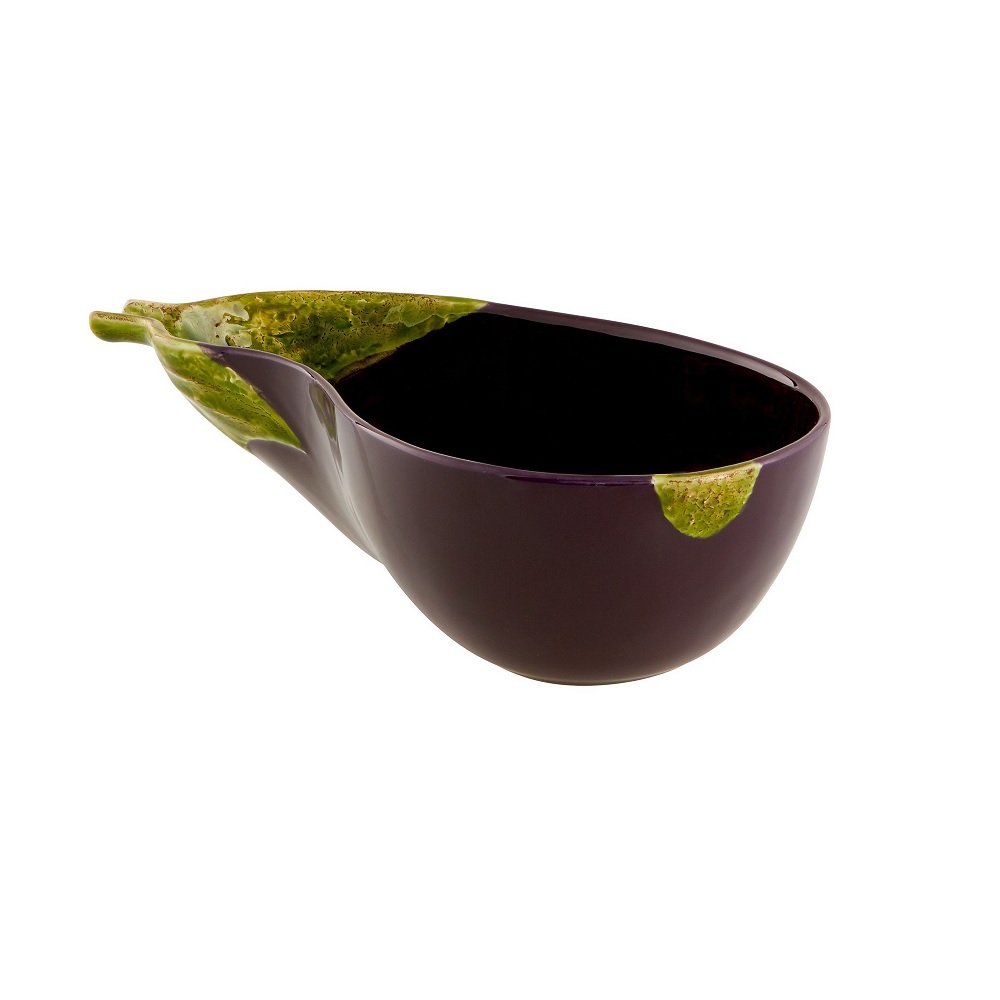 Салатник в виде половинки спелого баклажана выполнен из качественной прочной керамики в стиле майолика. Натуралистичный и естественный вид изделию придаёт роспись вручную и покрытие стойкой глазурью. Подача блюд в таком художественном произведении искусства приведёт в восторг всех участников застолья. Салатник можно ставить в микроволновую печь и мыть в посудомоечной машине.