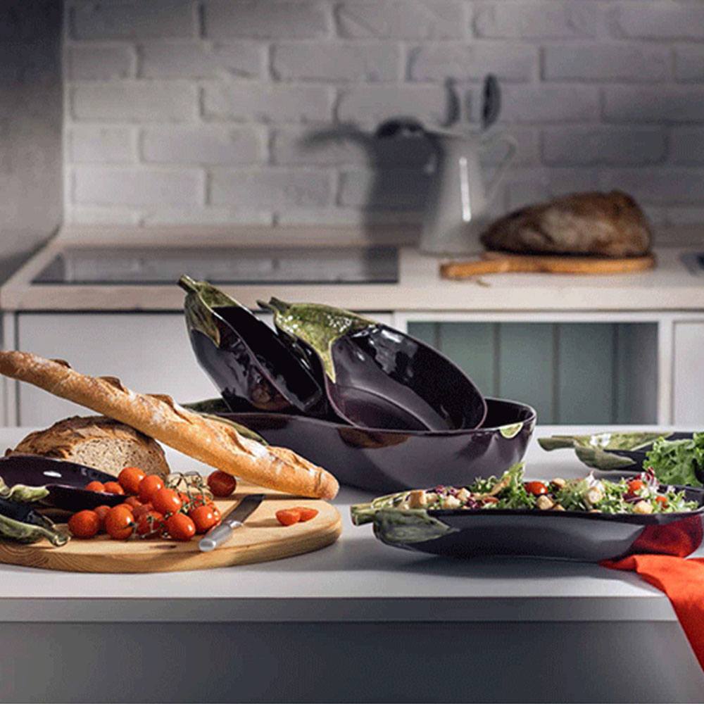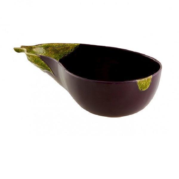 Салатник в виде половинки спелого баклажана выполнен из качественной прочной керамики в стиле майолика. Натуралистичный и естественный вид изделию придаёт роспись вручную и покрытие стойкой глазурью. Подача блюд в таком художественном произведении искусства приведёт в восторг всех участников застолья. Салатник можно ставить в микроволновую печь и мыть в посудомоечной машине.