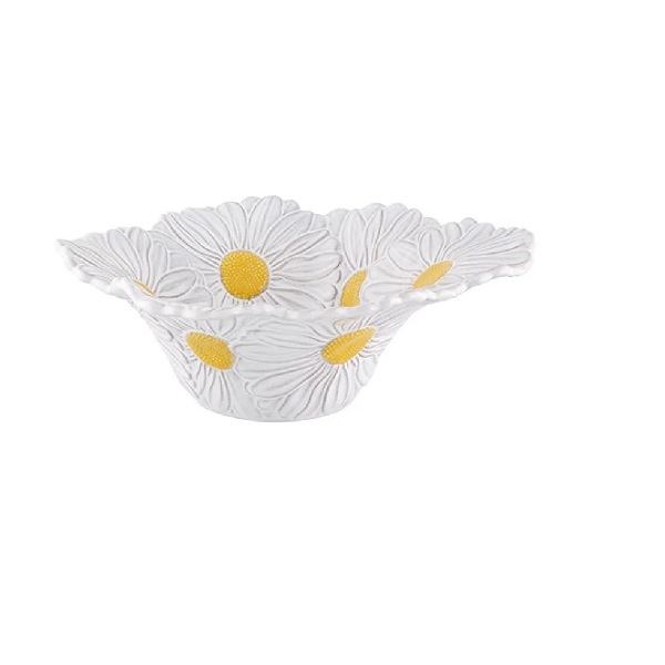 Яркая и летняя коллекция Цветы несомненно понравится своим оригинальным дизайном всем без исключения! Нарядная, лёгкая коллекция посуды в виде цветов завоевала сердца миллионов женщин. Салатник из ромашек дополнит вашу стильную кухню в квартире или загородном доме. Выполнен в стиле майолика – очень старинной технике производства керамики. Она представляет собой процесс, при котором глиняная основа, созданная мастером, покрывается глазурью с высоким содержанием свинца, а после подвергается обжигу. Можно мыть в посудомоечной машине и использовать в микроволновой печи.