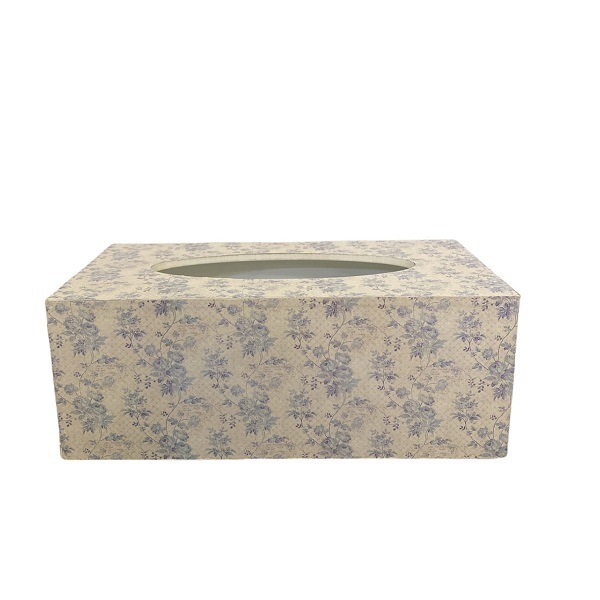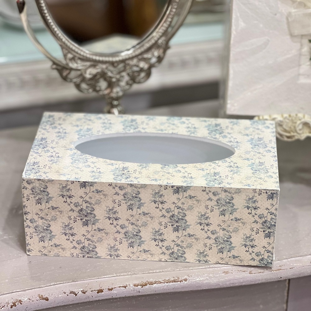 Коробка для салфеток с изображением голубых цветов позволяет всегда иметь салфетки под рукой.