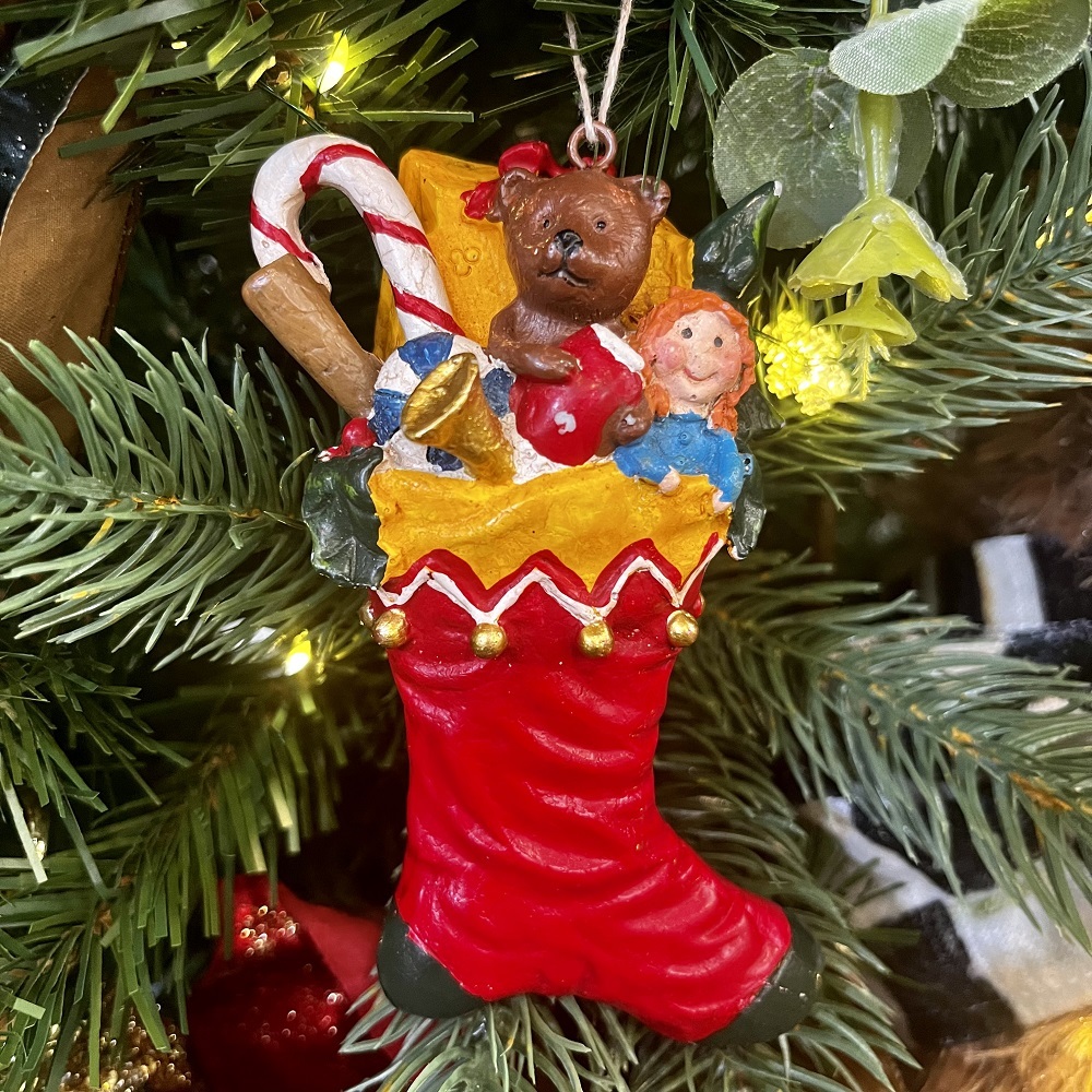 Яркий сапожок с многочисленными подарками символизирует достаток, потому станет достойным акцентом на ёлке.