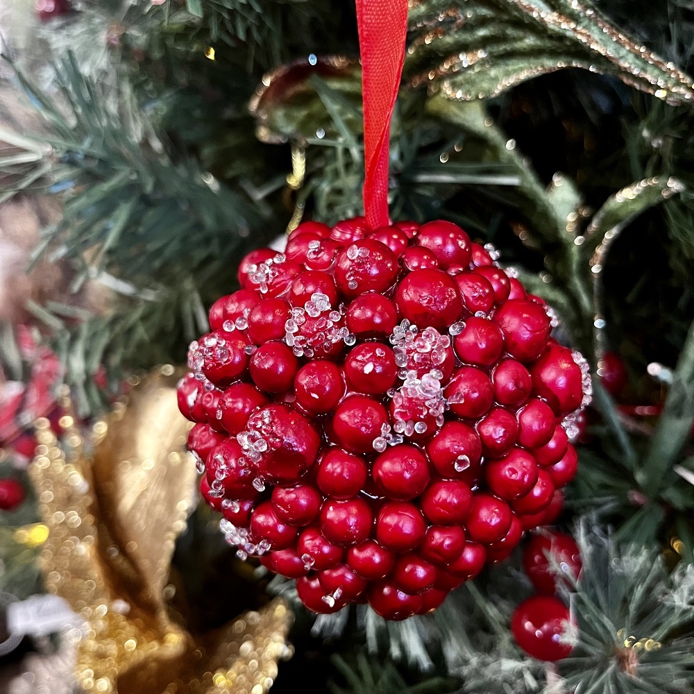 Шар из замороженных красных ягод. Такое украшение сочетается с игрушками в зелёных и красных цветах, а также будет хорошо смотреться на венке. Сделано вручную.
