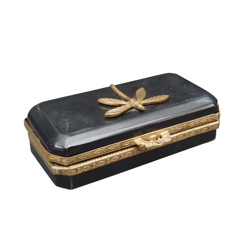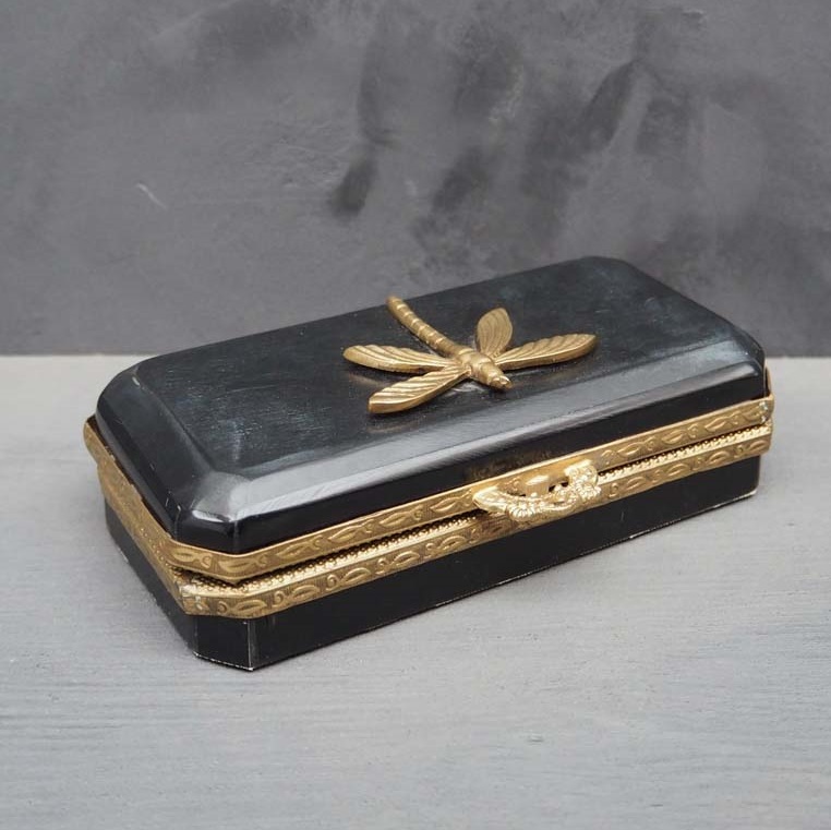 Шкатулка выполнена в винтажном стиле с черным корпусом и украшена декоративной металлической стрекозой, расположенной на крышке. По бокам и по краю шкатулки есть золотистая отделка с утонченными деталями, придающая изделию элегантный и роскошный вид. Такая шкатулка отлично подойдет для хранения украшений, косметики или мелочей, а её изысканный дизайн сделает украшением любого интерьера.
