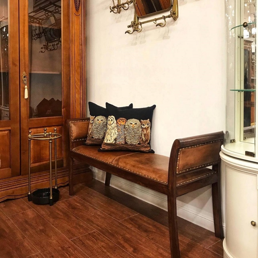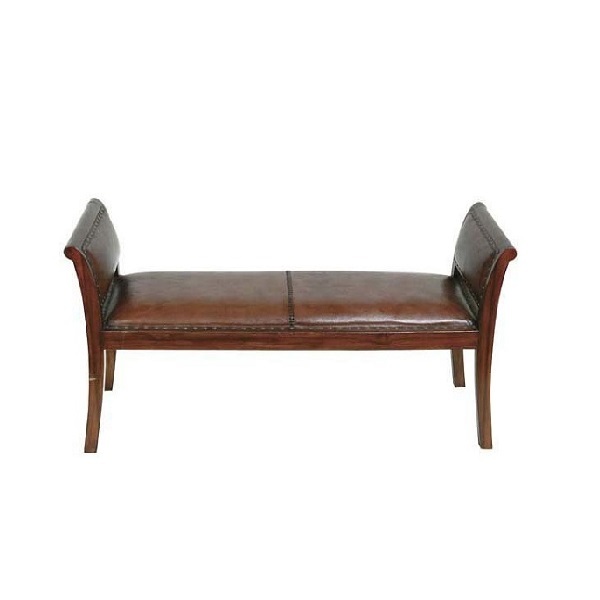 Банкетка на деревянных ножках с подлокотниками. Сидушка обтянута кожей коричневого цвета. Декор: металлические заклёпки.