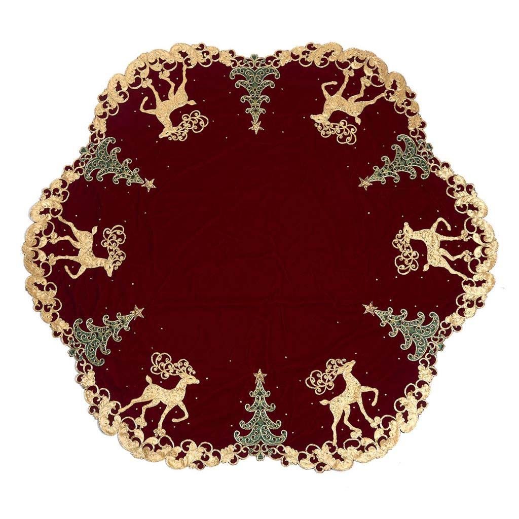 Скатерть станет интересным дополнением к вашему праздничному интерьеру. Ткань украшена узором в виде золотых оленей и зелёных ёлок. Ручная работа.