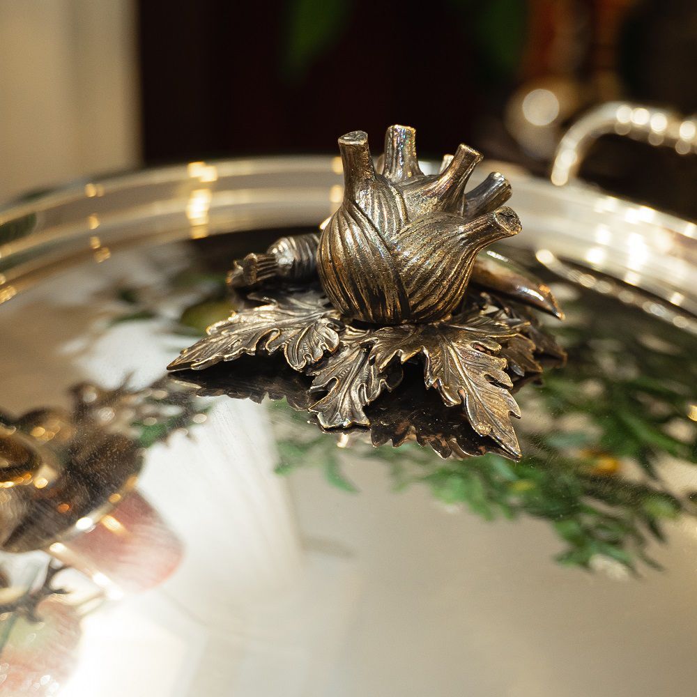 Крышка украшена латунной посеребренной ручкой, сделанной вручную в форме различных овощей. Может использоваться на любых типах плит, в том числе и на индукционных.