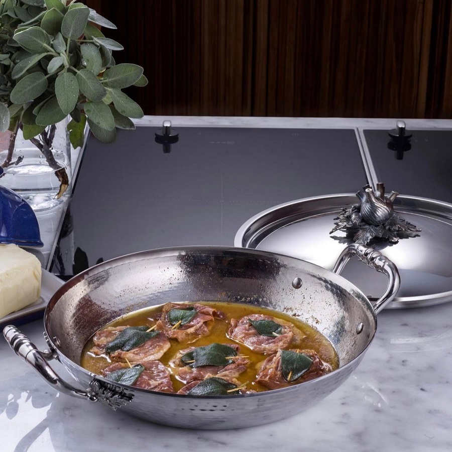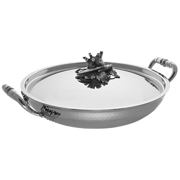 Крышка украшена латунной посеребренной ручкой, сделанной вручную в форме различных овощей. Может использоваться на любых типах плит, в том числе и на индукционных.