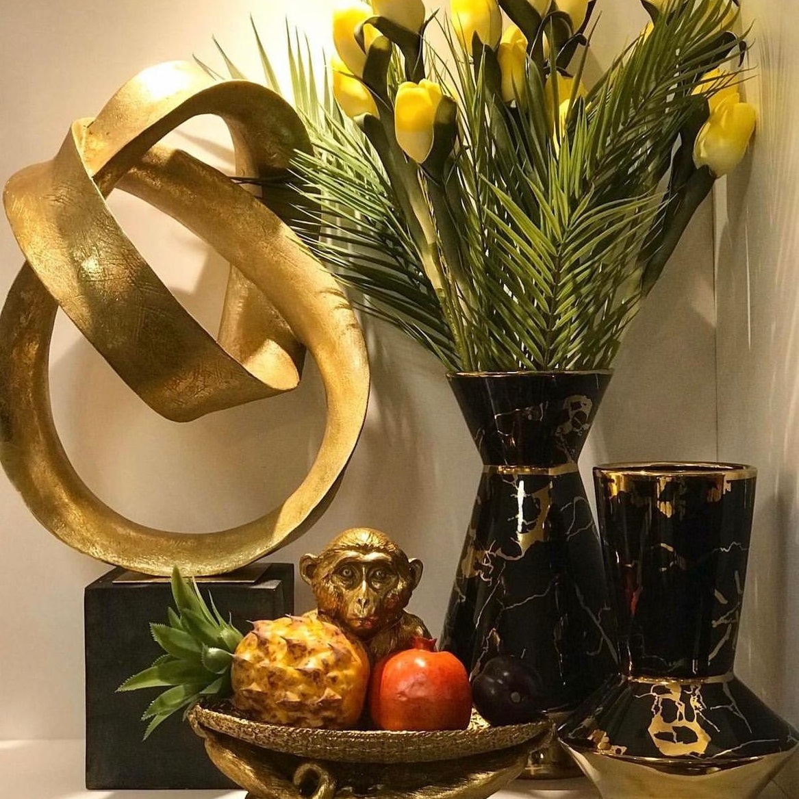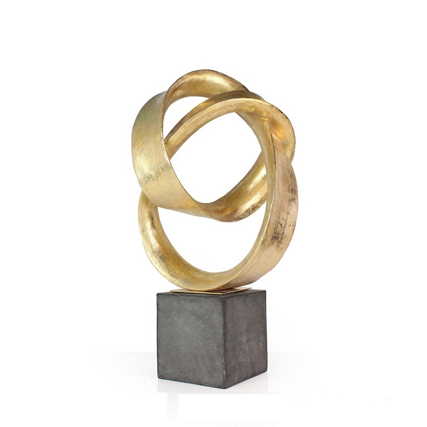 Абстрактная композиция в виде двух колец на прямоугольной подставке. Формы переплетающихся и изгибающихся лент создают ощущение динамики и движения. Скульптура имеет плавные, округлые линии, образующие сложную, но гармоничную структуру, напоминающую бесконечный узел или завитки, символизирующие вечность и непрерывность. Она установлена на простом черном кубическом основании, которое подчеркивает изящность и изысканность самой работы. Эта скульптура отлично подойдет для современного интерьера или как элемент арт-обстановки, привлекающий внимание своей абстрактной красотой и утонченностью.