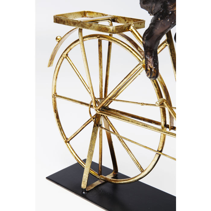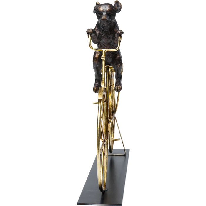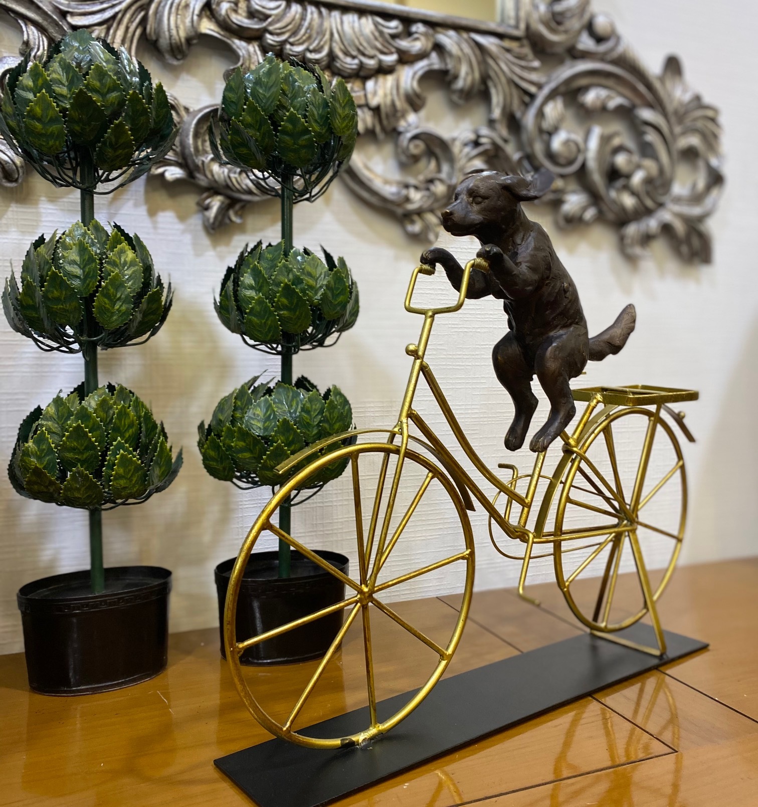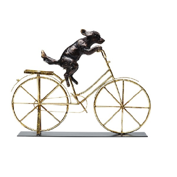Оригинальная скульптура собаки на велосипеде. Ручная работа из золотой стали и переливающейся синтетической смолы. Маленький гоночный велосипедист с его летающими ушами очаровывает. Почти также интересно смотреть как этап Тур де Франс.