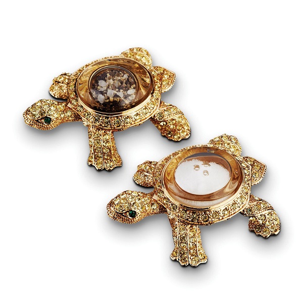 Набор из двух предметов — солонки и перечницы в форме черепах. Безупречная ручная инкрустация кристаллами Swarovski и покрытие золотом 24К. Они являются превосходным дополнением к сервировке стола. Благодаря таким прекрасным изделиям, повседневный обед превратится в царский прием. Набор представлен в подарочной коробке.
