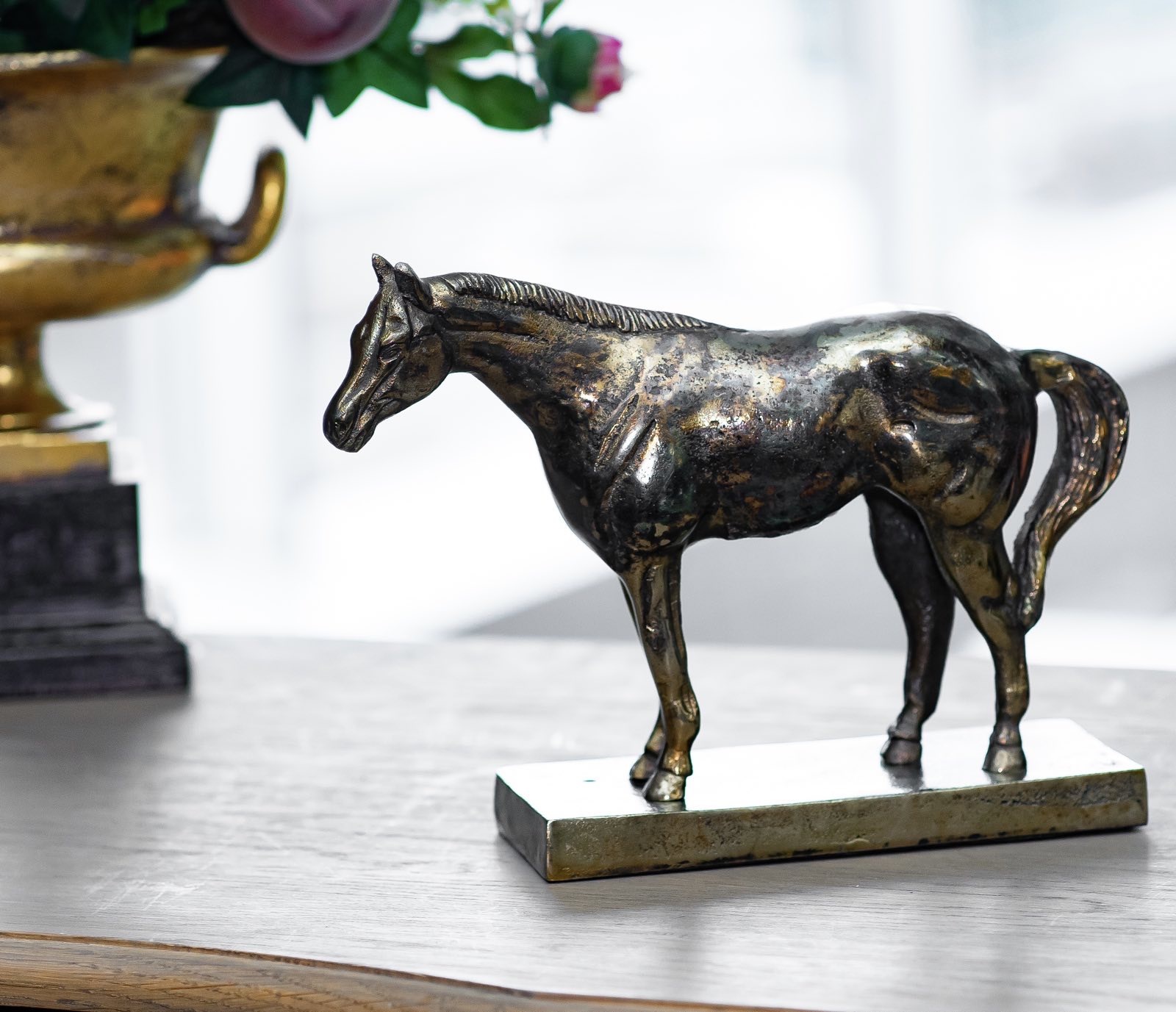 Украсьте свой стол или полку этой статуей лошади. Необычная отделка в глубоком бронзовом цвете.