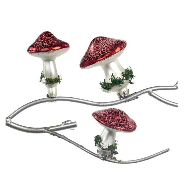 Красные мухоморы - нарядные игрушки на новогоднюю ёлку. Фигурки как будто по-настоящему выросли на еловых ветвях, а их красные шапочки будут нарядным акцентом среди зелёных ветвей новогодней ёлки. На украшении прдусмотрена клипса для более удобного крепления.