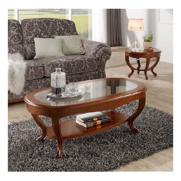Журнальный столик придает интерьеру выразительные классические черты. Великолепные изогнутые ножки поддерживают овальную деревянную столешницу с широкой стеклянной вставкой. Нижняя полочка дополняет гармоничную симметрию конструкции.
