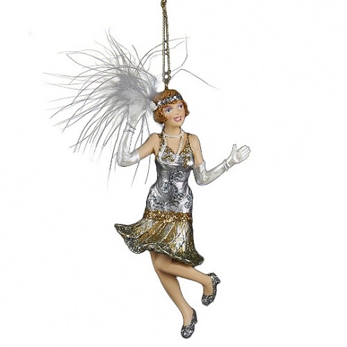 Невероятно изысканное и элегантное украшение-фигурка девушки-любительницы джаза, в ретро-наряде, в сверкающем мини-платье, сочетающем серебрянные и золотые элементы, блестящих туфельках и головным украшением с роскошными перьями. Кукла невероятно реалистична, и потому вдвойне привлекательна!