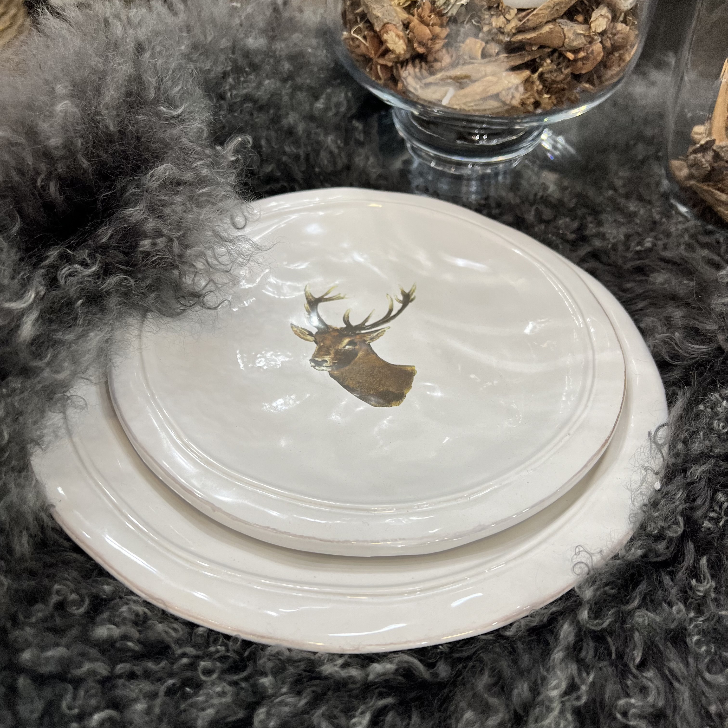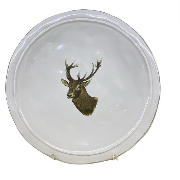 Такая тарелка станет отличным украшением для Вашего стола, а возможно, и фамильной реликвией. Выполнена из керамики, имеет тонкую окантовку и украшена оригинальным рисунком в виде благородного оленя.