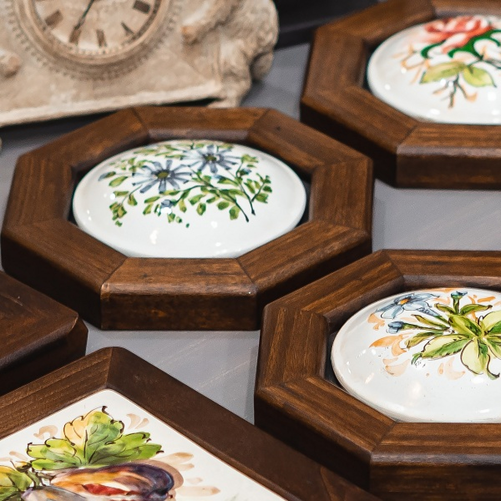 Настенные натюрморты, яркие композиции разрезанных фруктов и фрукты в различных техниках исполнения – классический и уже традиционный декор кухни и столовой зоны. Ручная роспись на плитке будет смотреться очень выигрышно, благодаря высокой технике исполнения и обрамлению из натурального дерева.