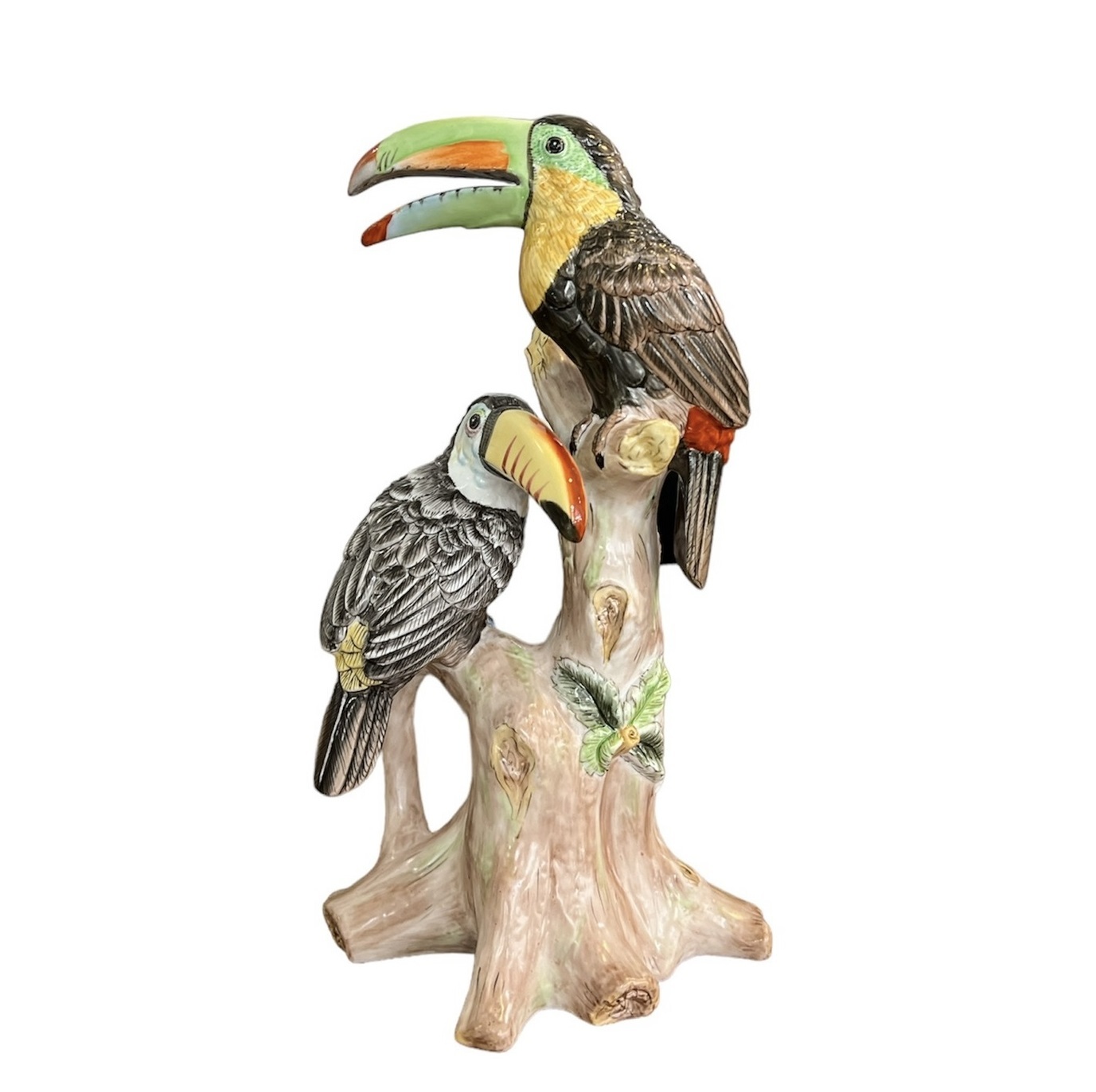 Туканы на ветке выглядят очень натурально: художникам удалось совместить реализм и романтизм в оформлении птиц. У них яркий клюв и тёмное полосатое тельце. Красавцы восседают на ветке-жёрдочке; их можно определить в сад или оранжерею, а также украсить большую комнату или домашний кабинет.