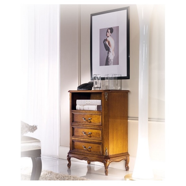 Тумба украшена стилизованной фурнитурой, рельефной резьбой с классическими мотивами, точёными фигурными элементами, декорирована изысканными инкрустациями.